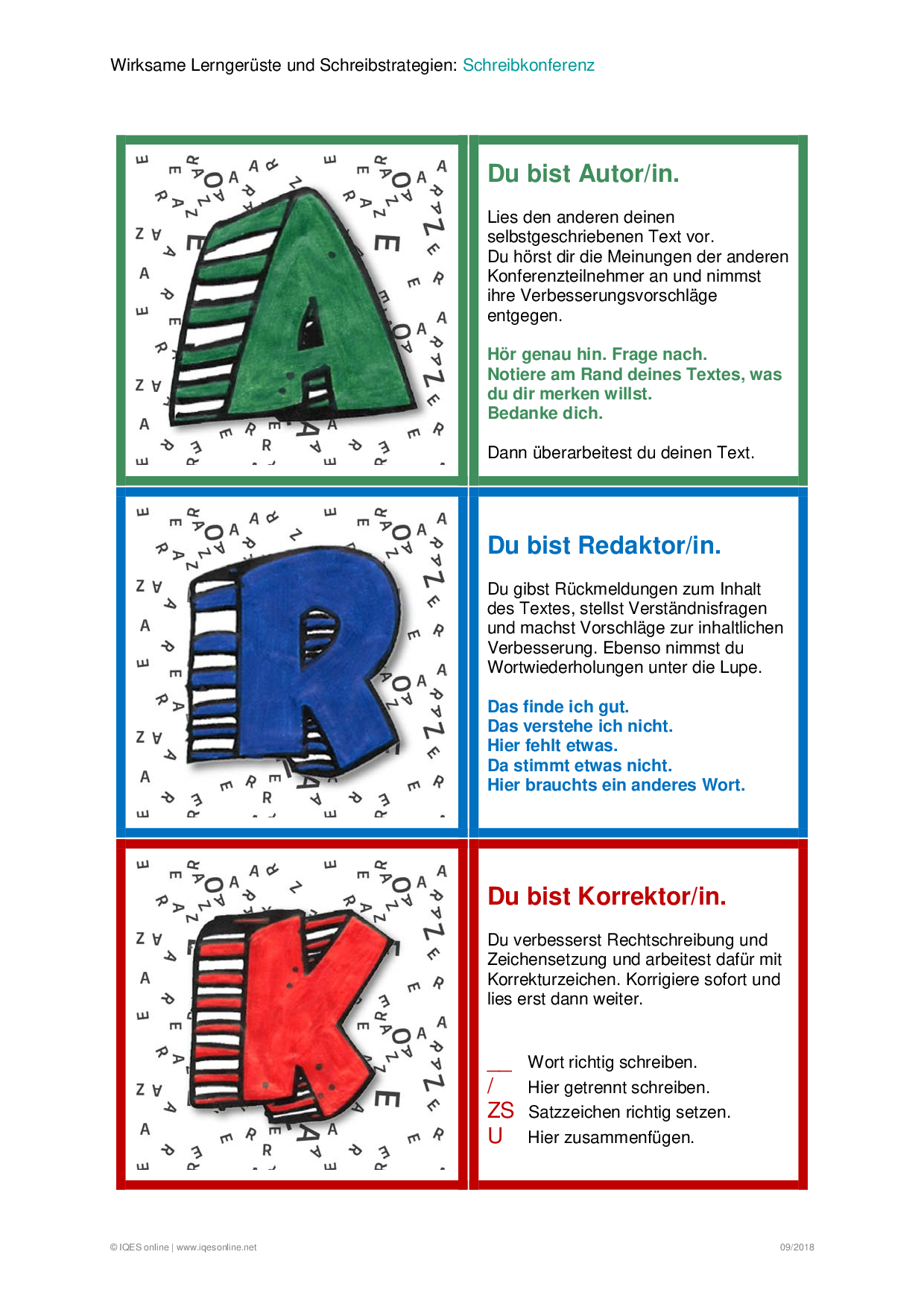 Schreibkonferenzen ermöglichen den Schülern und Schülerinnen, in Kleingruppen an ihren Texten zu arbeiten und dabei zu lernen, sich mit anderen Sichtweisen vertraut zu machen, diese zu akzeptieren, zu bestätigen oder in begründeter Weise abzulehnen und auch selber und frei zu entscheiden, welche Inputs im eigenen Text übernommen werden sollen. Die Rollenkarten beschreiben, welche Rolle (Autor, Redaktor, Korrektor) welche Pflichten hat, womit eine strukturierte Feedbackrunde ermöglicht wird.