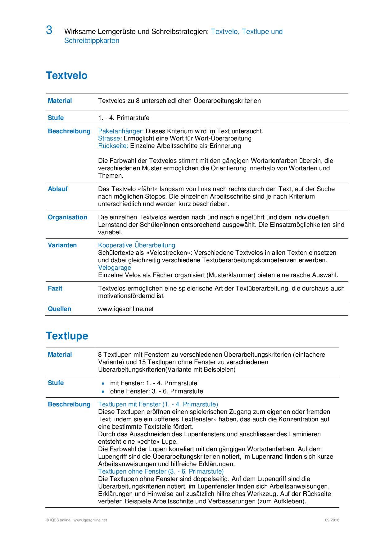 Textvelo, Textlupe und Schreibtippkarten bieten auf altersgerechte Weise eine kriteriengeleitete, konstruktive und verständliche Unterstützung im Überarbeitungsprozess von eigenen und fremden Texten und können gleichzeitig auch den Schreibprozess wirksam begleiten und steuern.