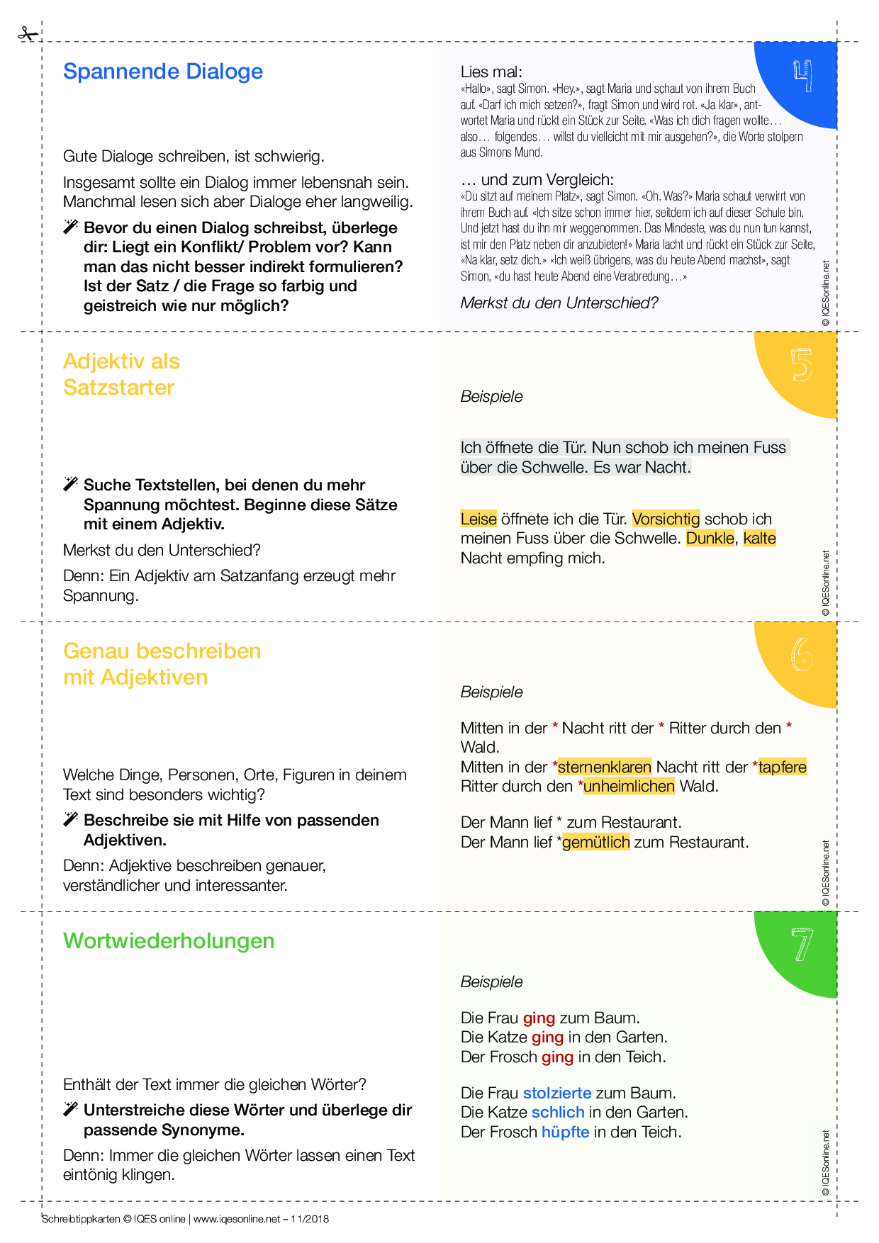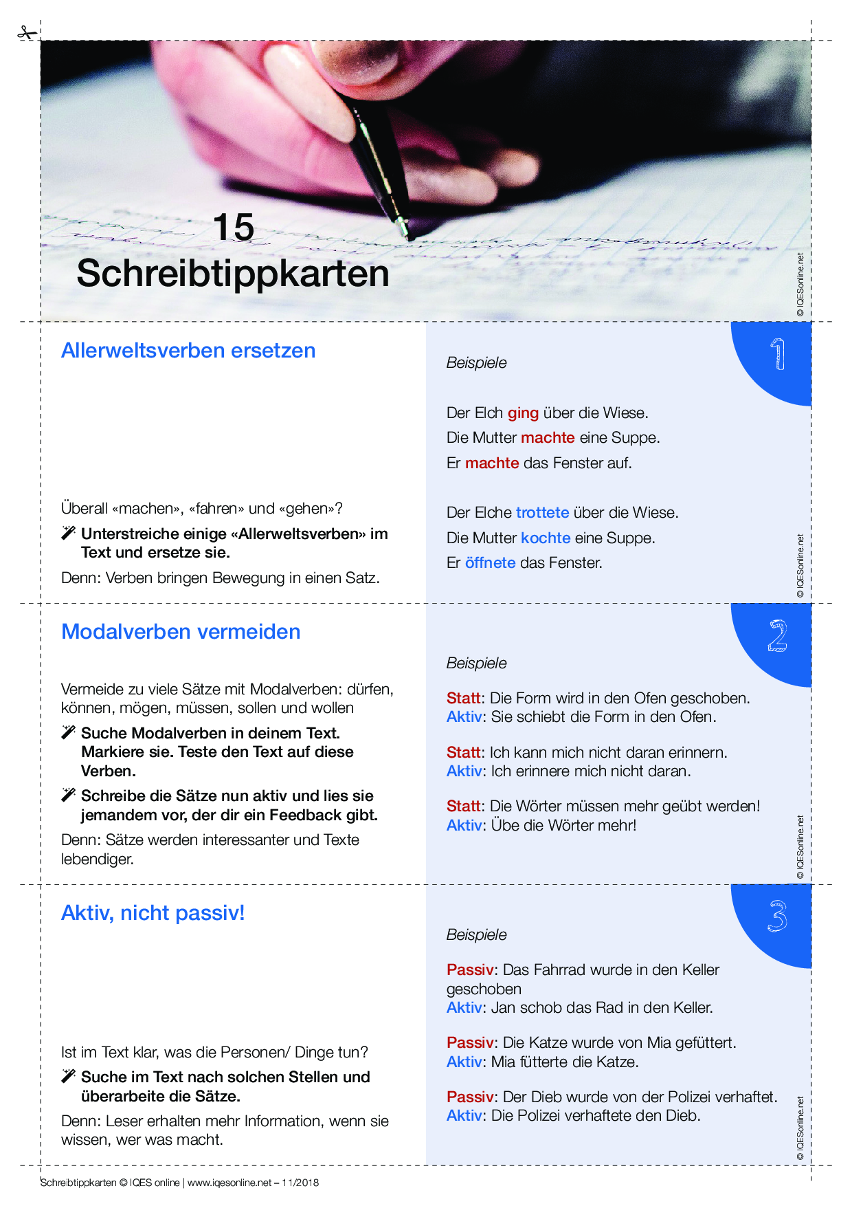 Die Schreibtippkarten bieten Orientierung über 15 verschiedene Überarbeitungskriterien in Texten. Die einzelnen Überarbeitungskriterien finden sich im Titel, Arbeitsauftrag, Tipps und Hintergrundinfos dazu bilden den Inhalt der Karte. Die Farbwahl stimmt mit den gängigen Wortartenfarben überein.
