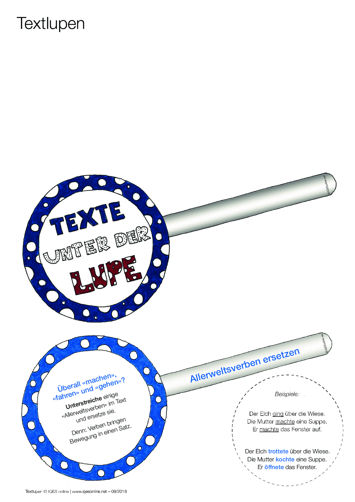 Die Textlupen dienen als Hilfestellung für die Textüberarbeitung, einzeln oder kooperativ, indem sie Merkmale eines guten Texts aufzeigen. Zudem können die Textlupen auch fächerübergreifend zum Einsatz kommen.