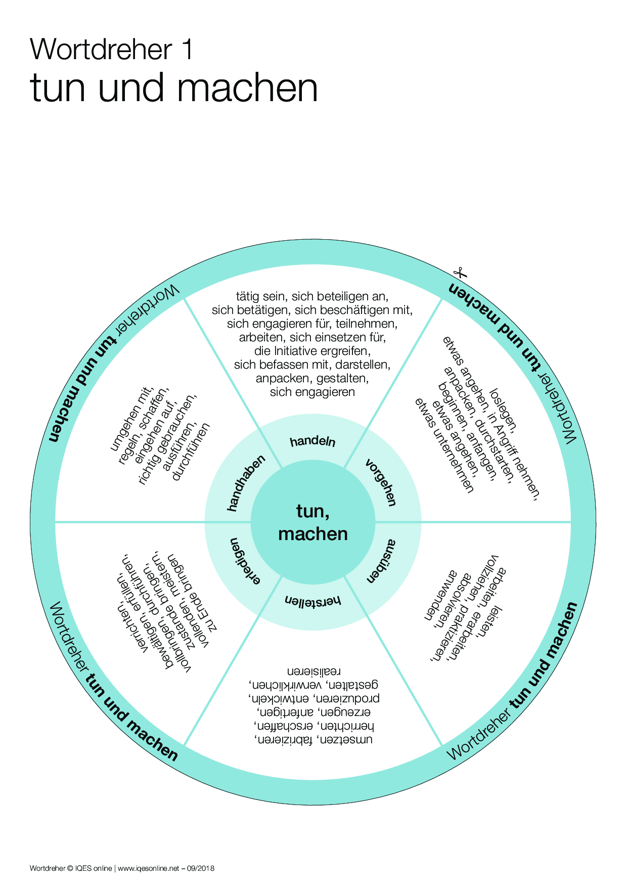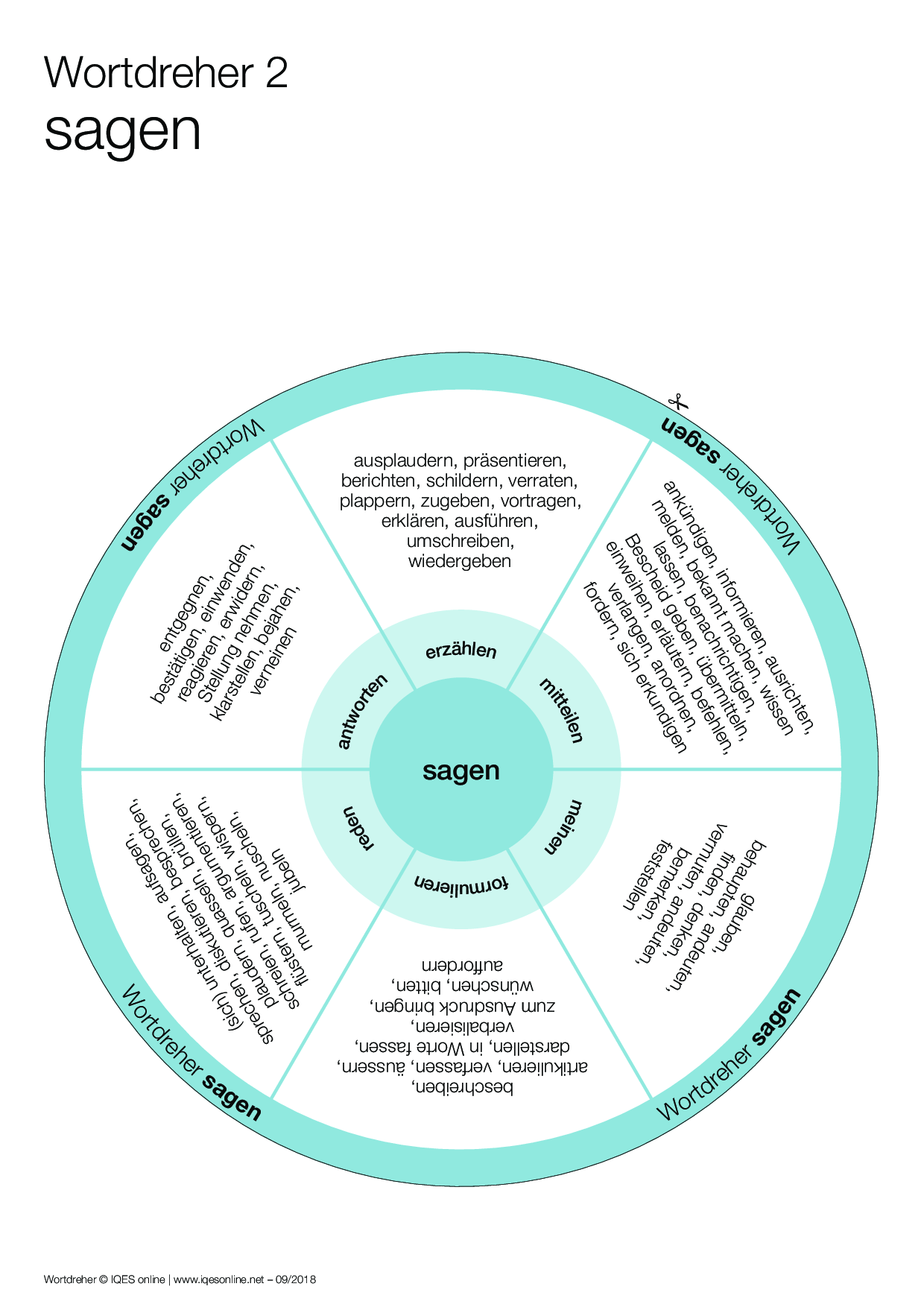 Die Wortdreher ermöglichen es den Schreibenden, durch eine gut strukturierte Übersicht Wortalternativen auf einen Blick zu erfassen und damit auch nach und nach den eigenen Wortschatz zu erweitern. Die Einteilung in drei Ringe differenziert häufig gebrauchte «Allerweltswörter» gleich zweifach und bietet dadurch eine große Vielfalt an Varianten.