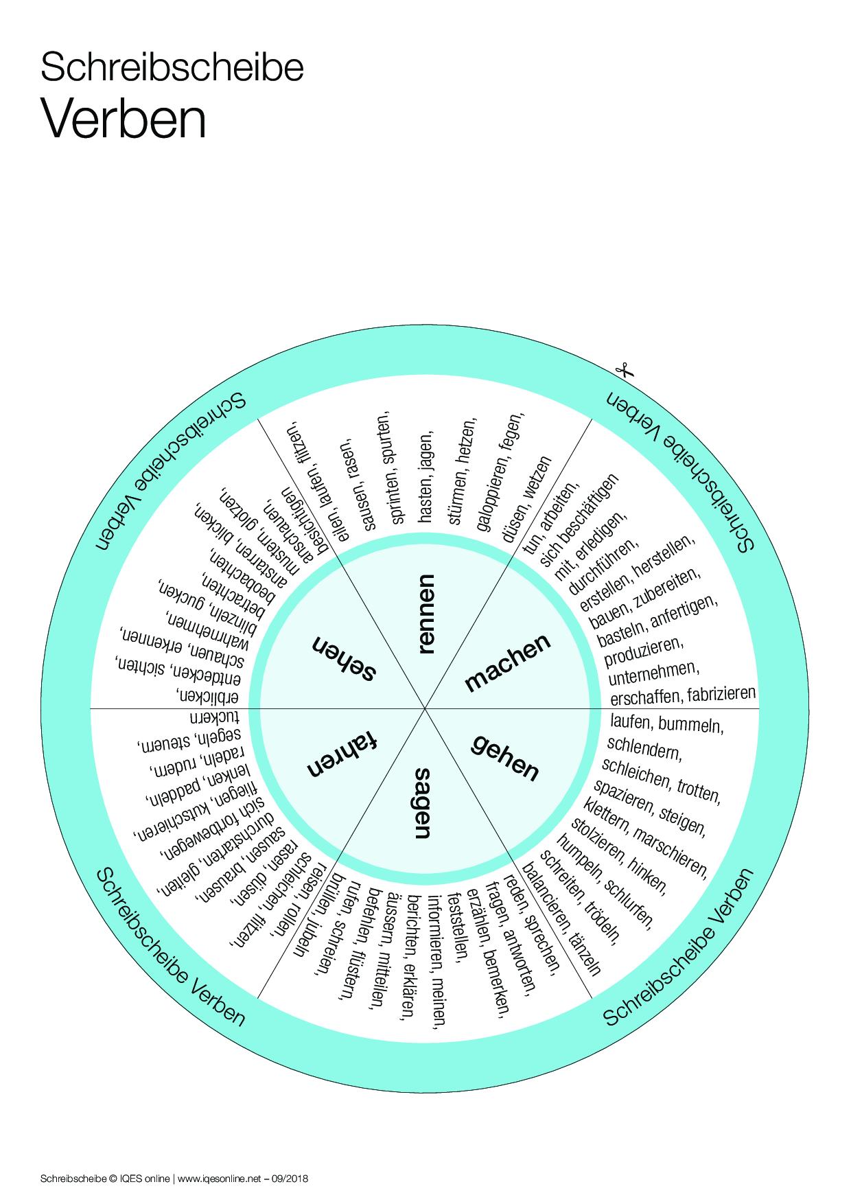 Die Schreibscheibe hilft dabei, die richtigen Wörter zu finden und dabei nicht nur immer bei denselben Verben zu verharren. So können Lernende darauf Synonyme für stehen, rennen, machen, gehen, sagen und fahren finden.