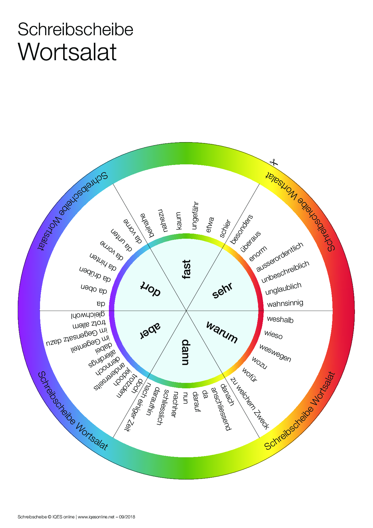 Die Schreibscheibe hilft dabei, die richtigen Wörter zu finden und dabei nicht nur immer beim Grundwortschatz zu verharren. So können Lernende darauf Synonyme für aber, dort, fast, sehr, warum und dann finden.