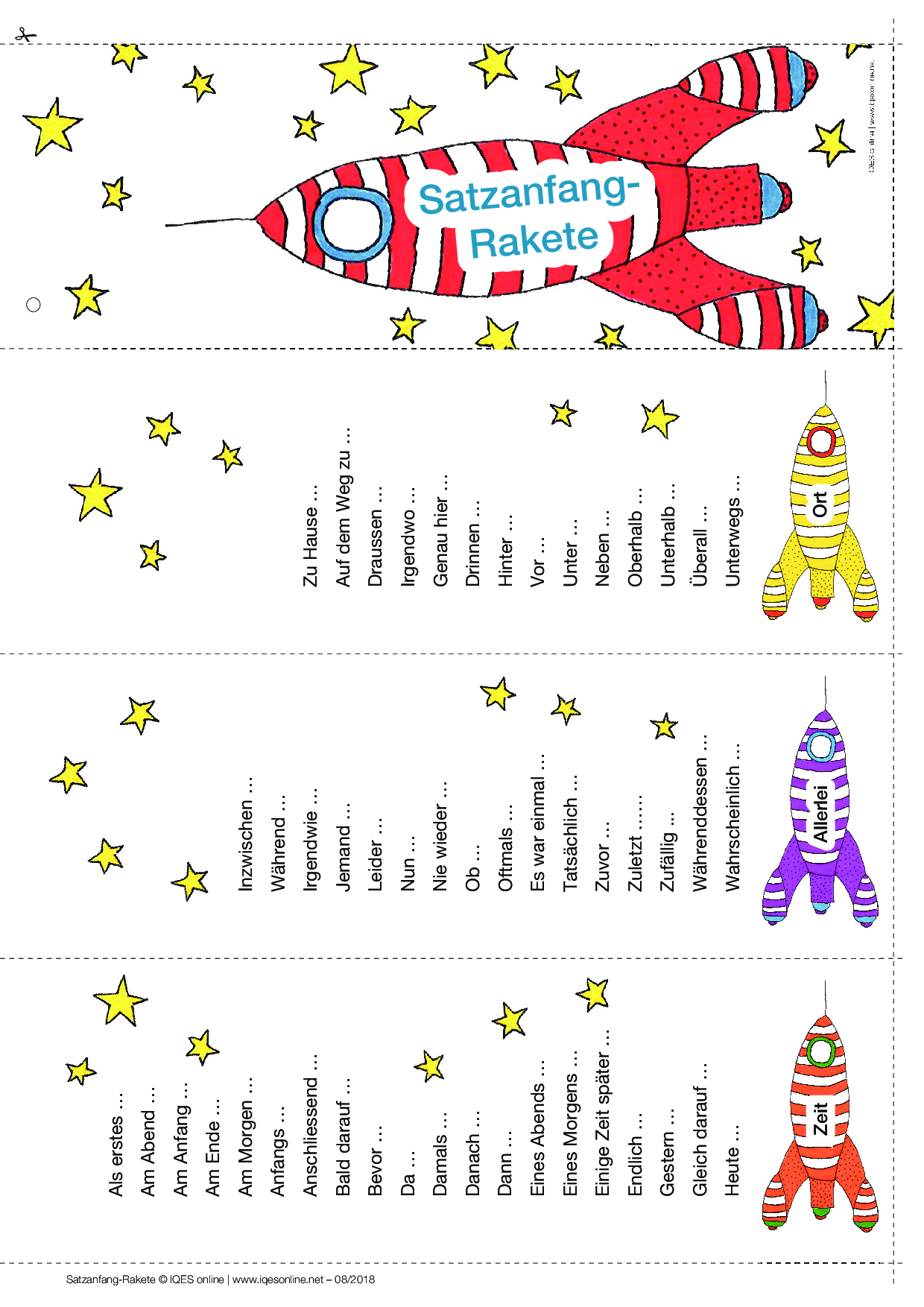 Dieser Satzanfangfächer hilft bei der Auswahl und Formulierung von Satzanfängen. Er bietet eine strukturierte und übersichtliche Auswahl an Satzanfängen. Diese sind in die Kategorien Zeit, Ort, Allerlei, Meinung, Begründung und Spannung unterteilt.