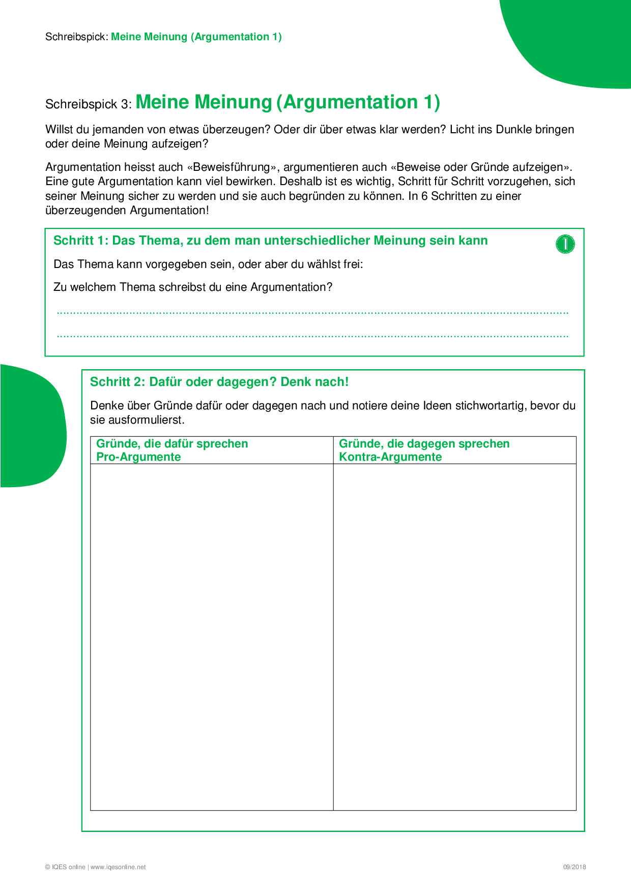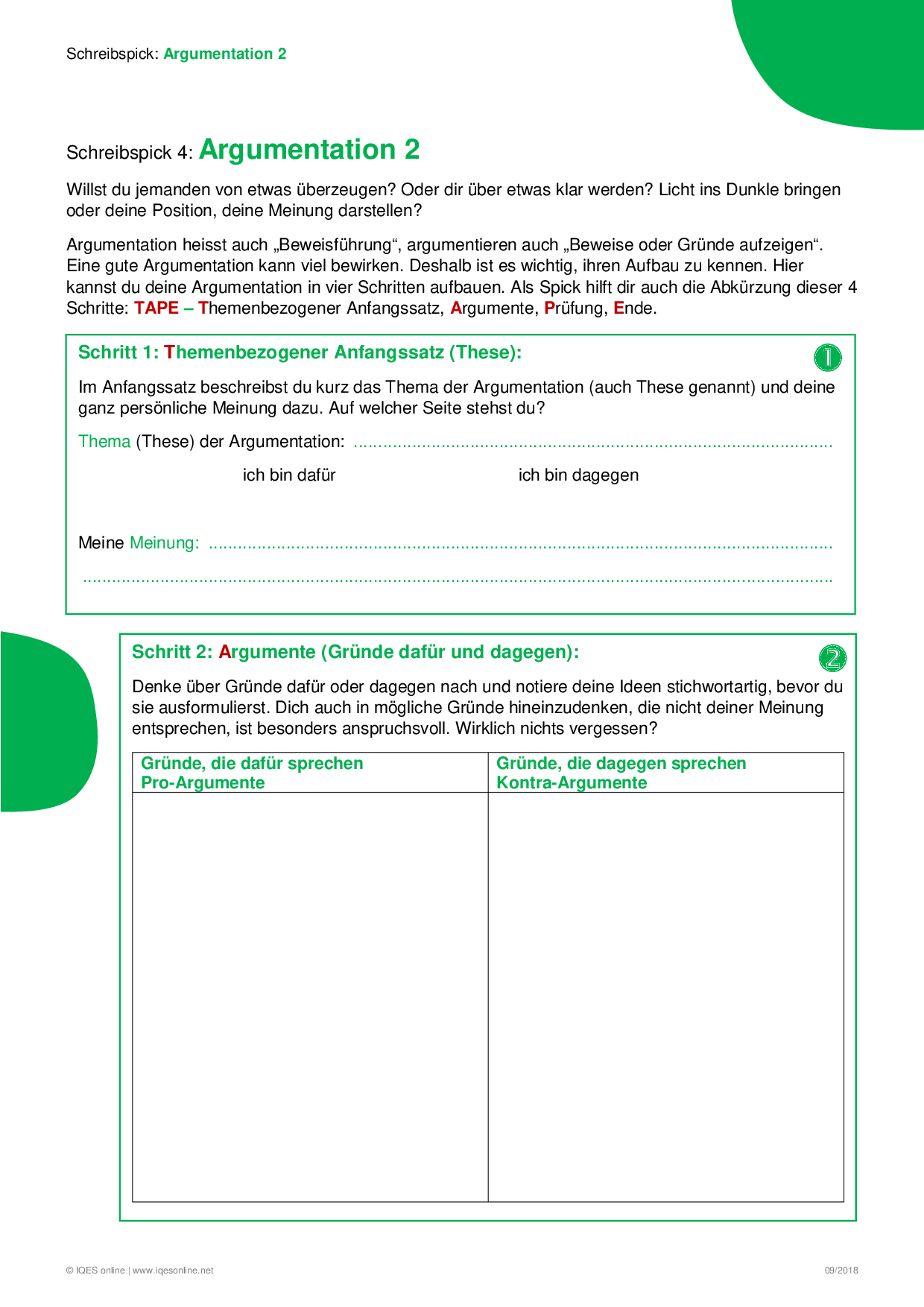 Mit diesem Schreibspick gelingt den Schüler/innen eine gute Argumentation. Deren Aufbau wird in vier Schritten erklärt und zur individuellen Bearbeitung der Schüler/innen bereit gestellt.