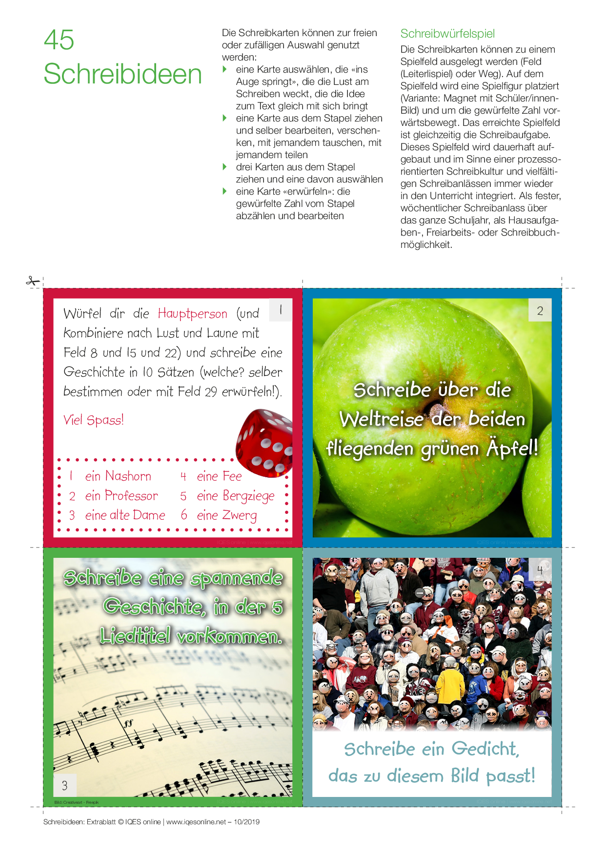 Die 45 Schreibideen für die 7.-12. Klasse sind das Pendant zu den Karten für Jüngere und bieten motivierende und fantasieanregende, kurze Schreibanlässe, die analog oder digital umgesetzt werden können.