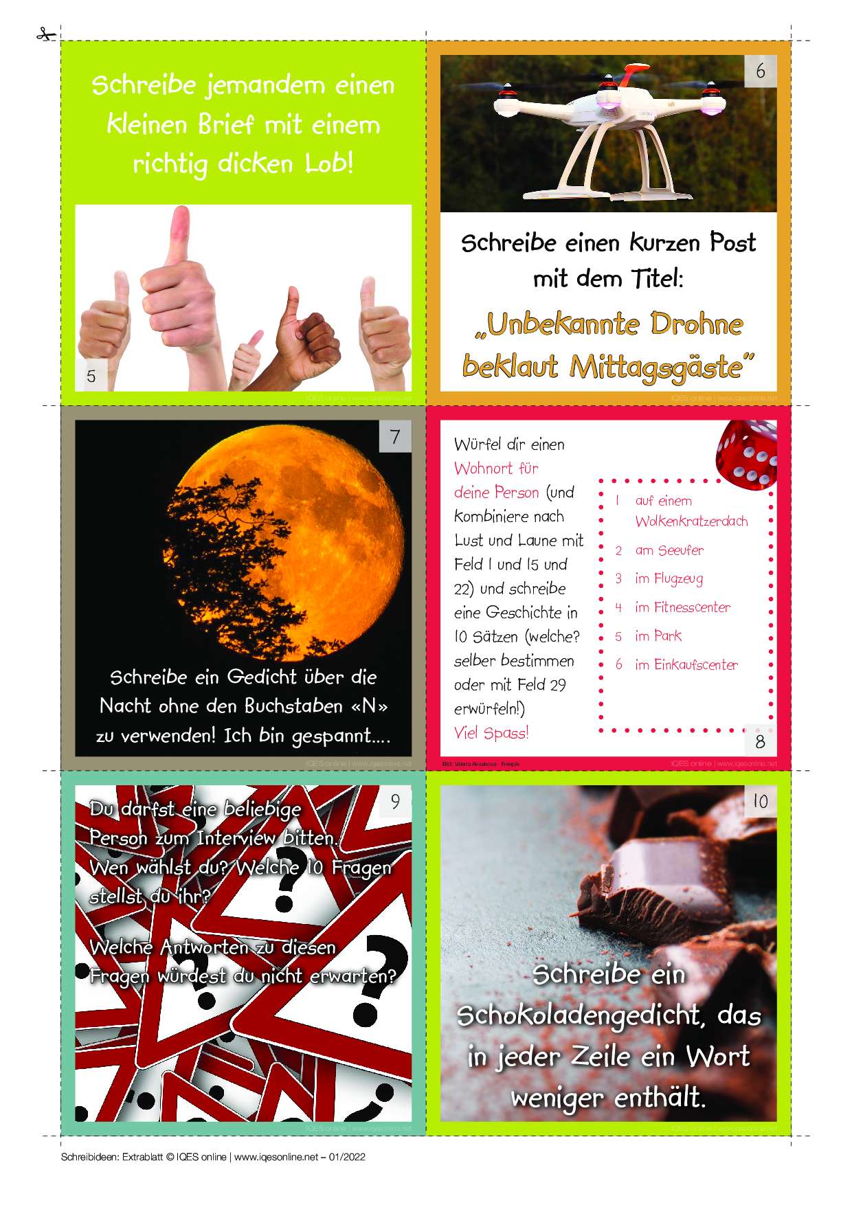 45 Schreibkarten mit den unterschiedlichsten Schreibideen: Sie können als Schreibwürfelspiel, als Schreibwegplaner, als Schreibkarten oder andersweitiger Ideenlieferanten eingesetzt werden. Die Schreibkarten können zur freien oder zufälligen Auswahl genutzt werden.