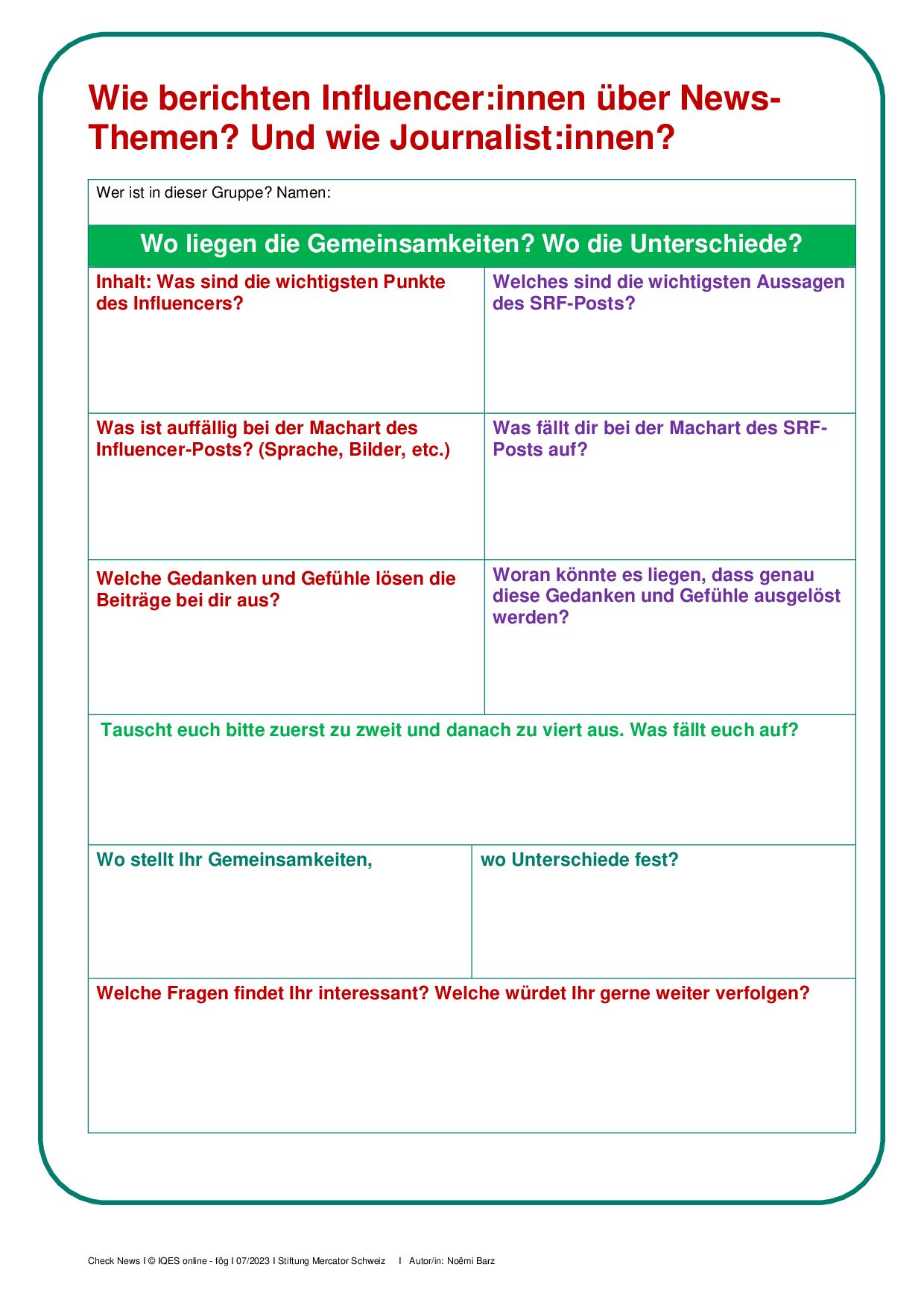 Nimm dir Zeit für dich: Bitte beantworte die Fragen auf dem Blatt »Social Media – Journalist:innen und Influencer:innen« zuerst für dich allen und mache dir auf dem Blatt Notizen für den Austausch mit Anderen.