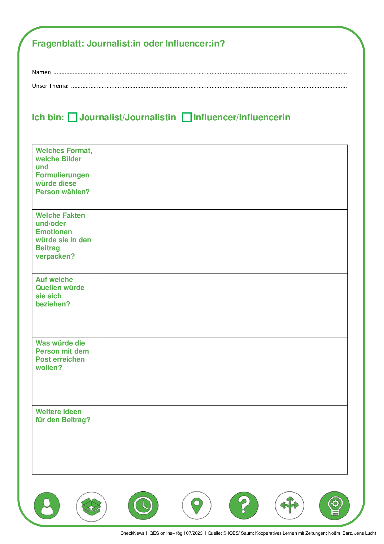 Nimm dir Zeit, um dir deine Antworten zu überlegen. Du kannst sie auf dem Fragenblatt »Journalist:in oder Influencer:in« notieren.