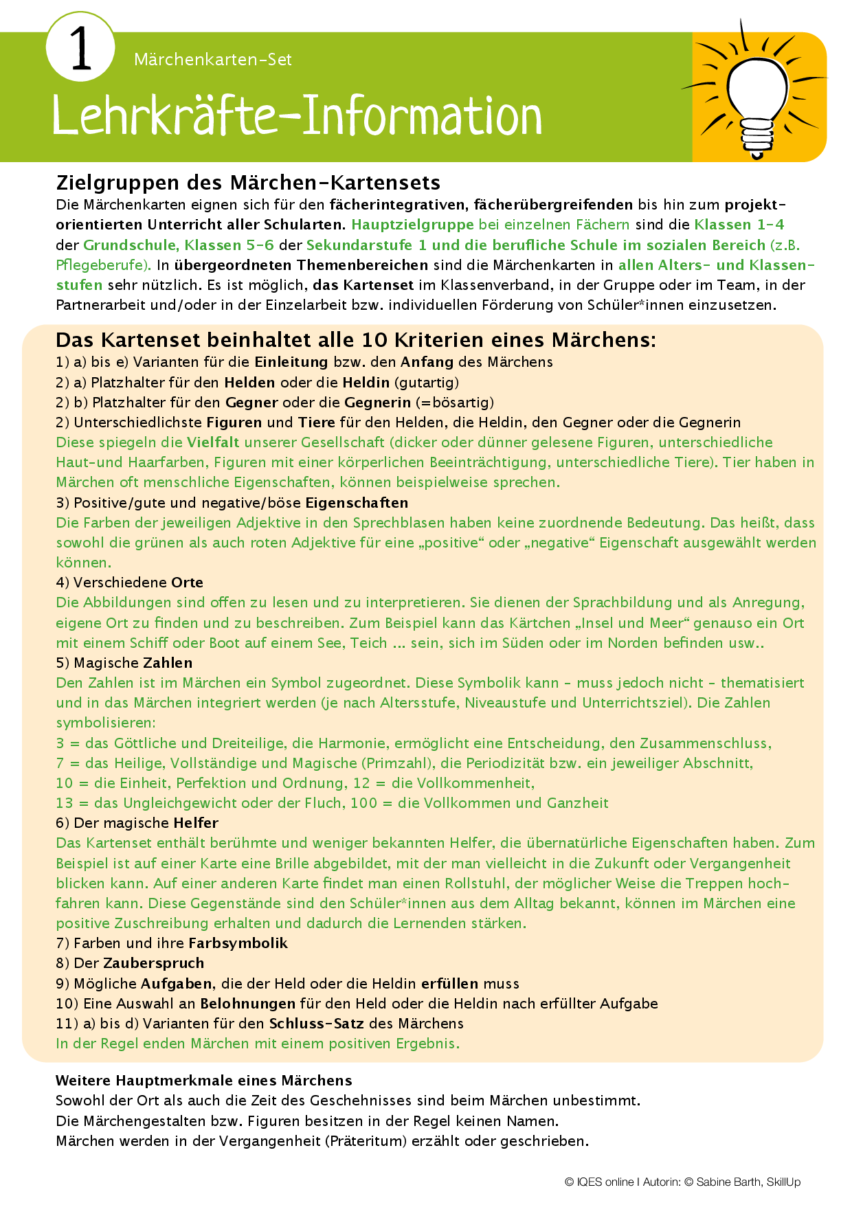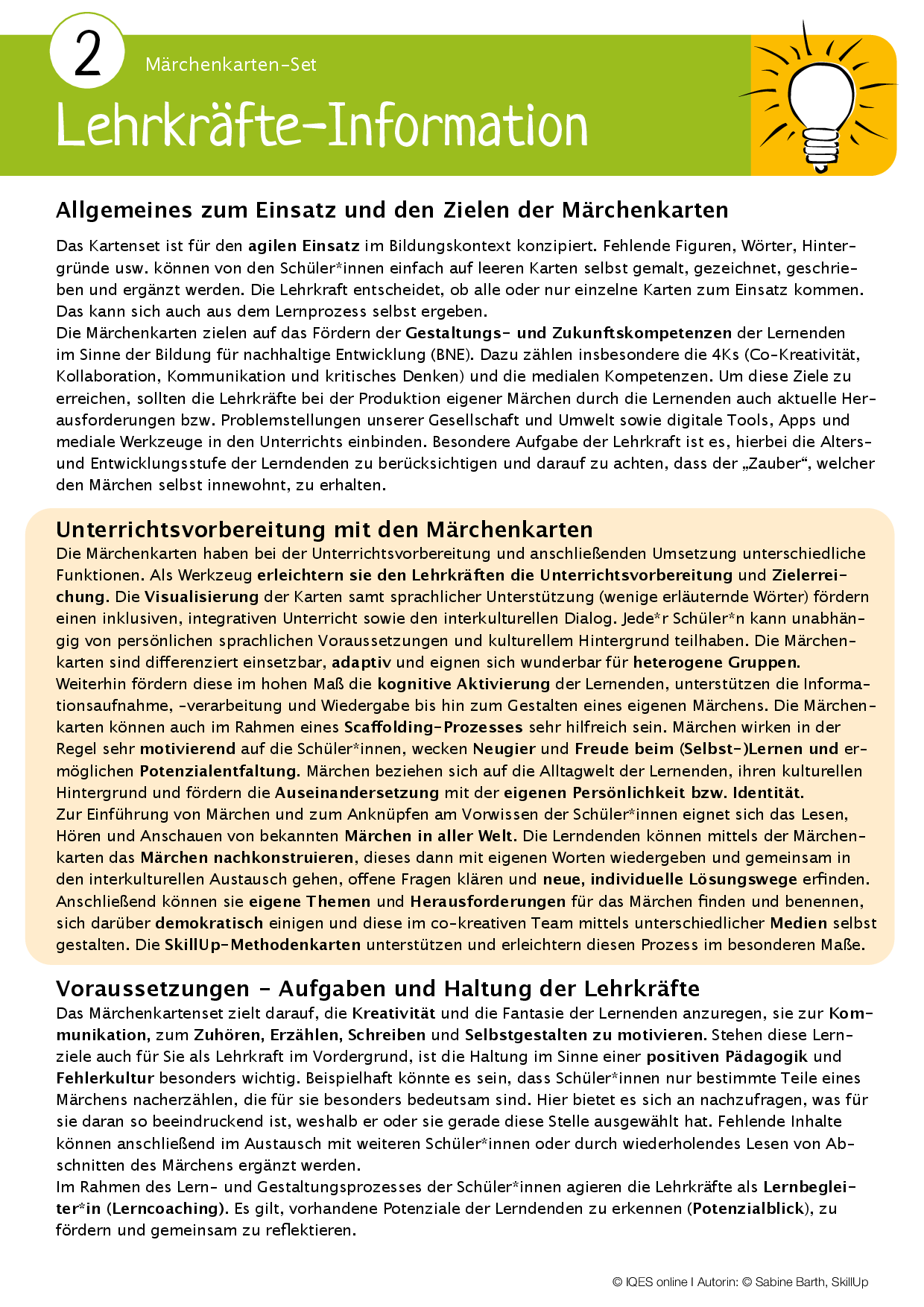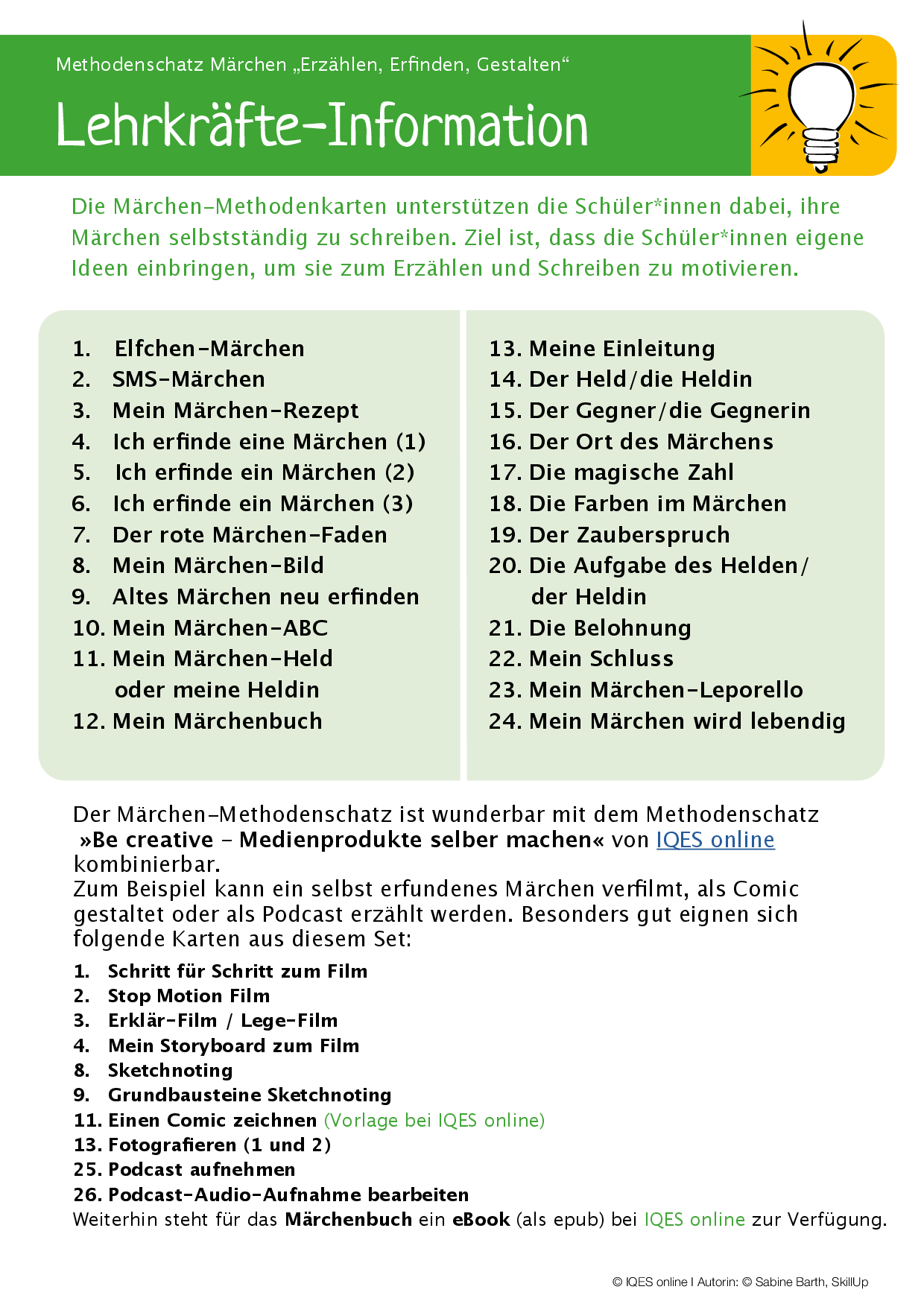 Die Lehrkräfte-Information gibt Impulse, wie die Märchenkarten und der Methodenschatz im fächerintegrativen, fächerübergreifenden bis hin zum projektorientierten Unterricht eingesetzt werden können.