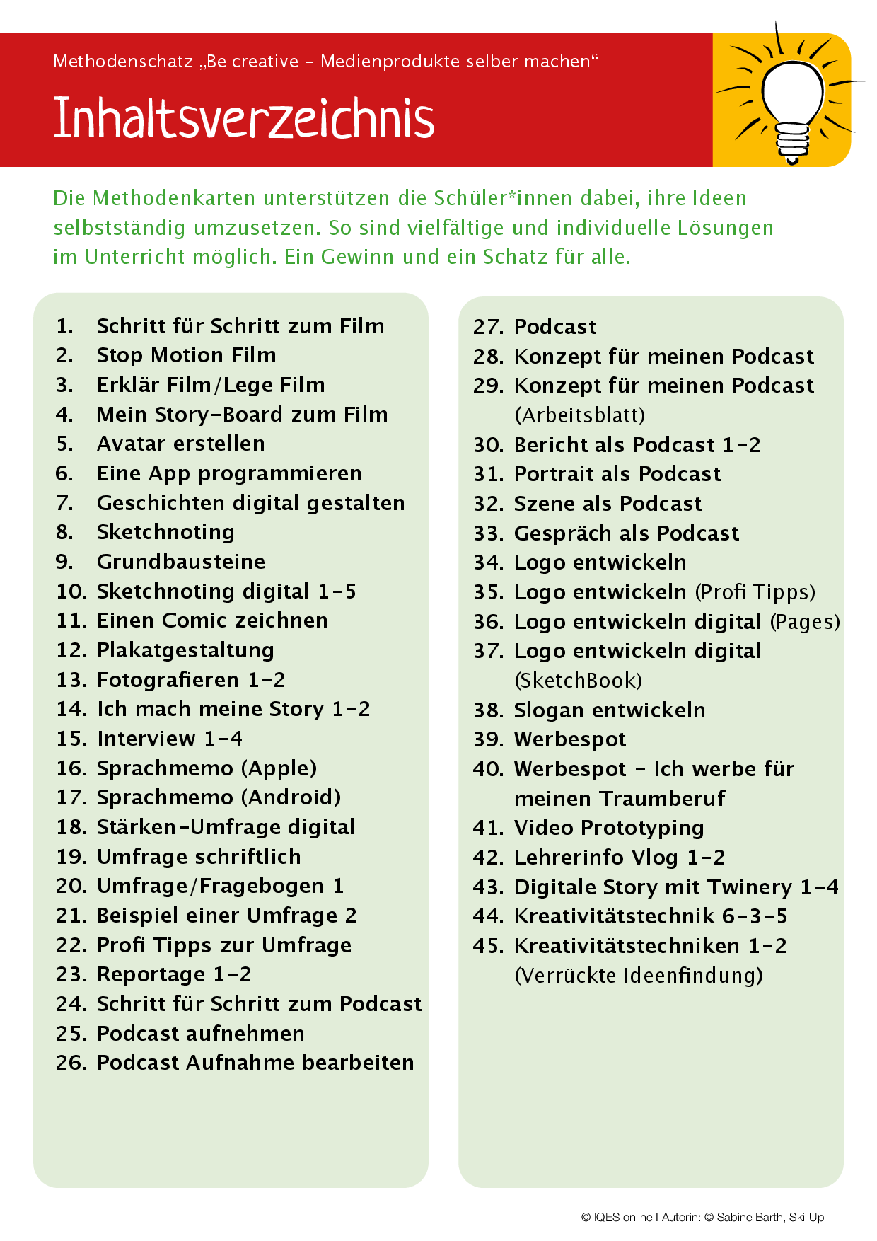 Vom kreativen Plakat, zur digitalen oder analogen Story, zum Podcast, Erklär-Film bis hin zum Mockup, der Methodenkarten-Schatz macht es den Lehrkräften und Lernenden möglich. Mit den Schritt-für-Schritt-Anleitungen gestalten Schüler:innen individuelle Medienprodukte und lernen zunehmend selbständig.