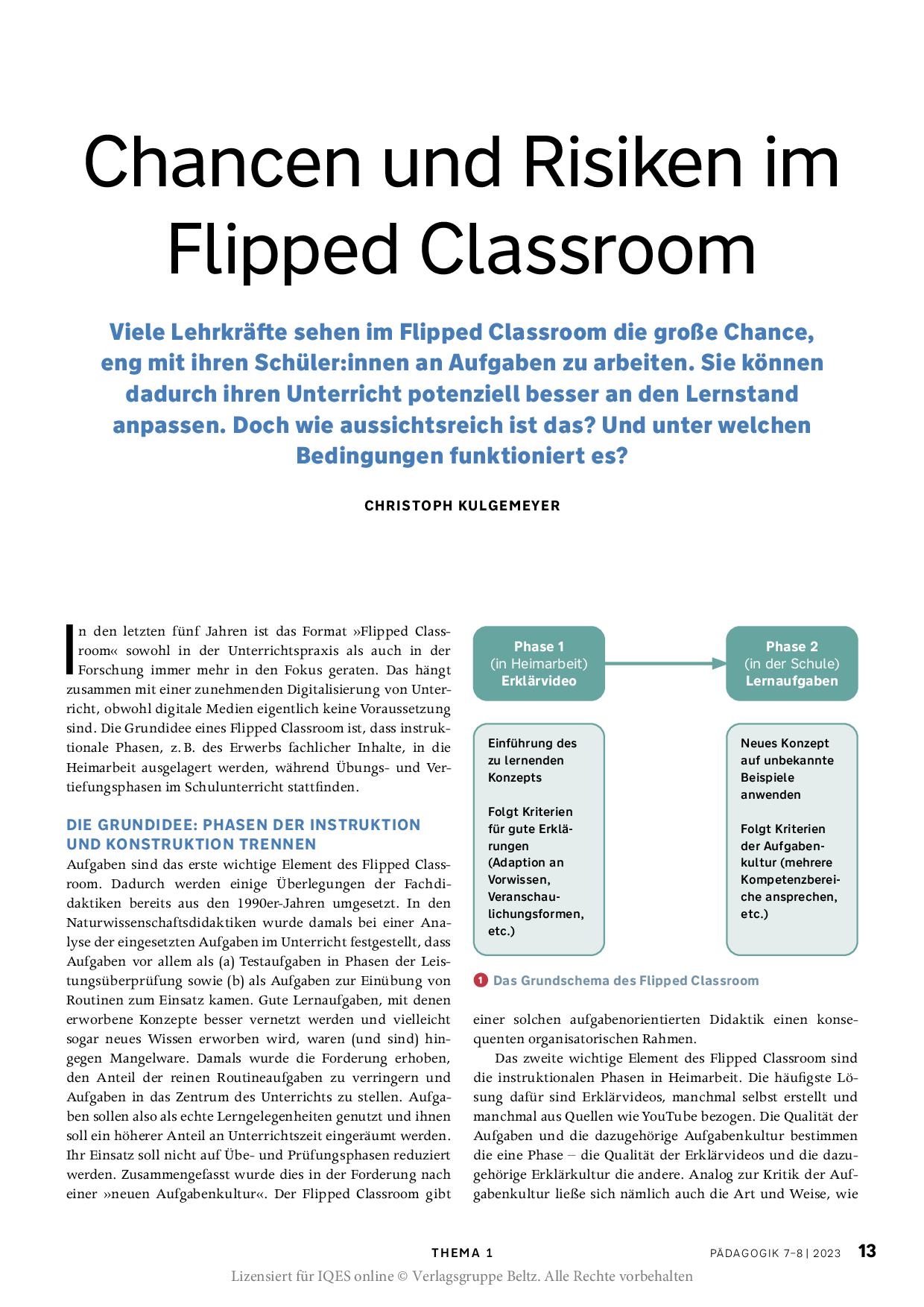 Viele Lehrkräfte sehen im Flipped Classroom die große Chance, eng mit ihren Schüler:innen an Aufgaben zu arbeiten. Sie können dadurch ihren Unterricht potenziell besser an den Lernstand anpassen. Doch wie aussichtsreich ist das? Und unter welchen Bedingungen funktioniert es?
