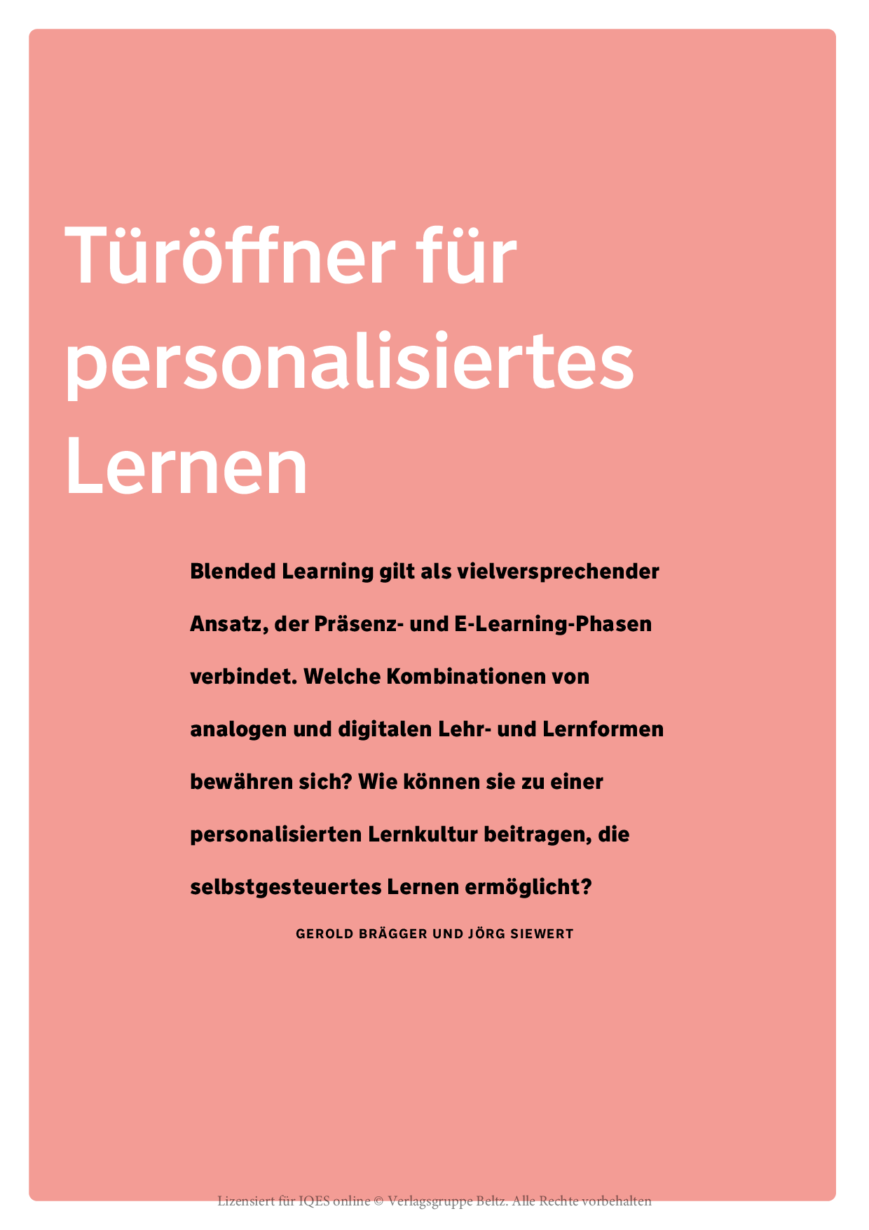 Blended Learning gilt als vielversprechender Ansatz, der Präsenz- und E-Learning-Phasen verbindet. Welche Kombinationen von analogen und digitalen Lehr- und Lernformen bewähren sich? Wie können sie zu einer personalisierten Lernkultur beitragen, die selbstgesteuertes Lernen ermöglicht?