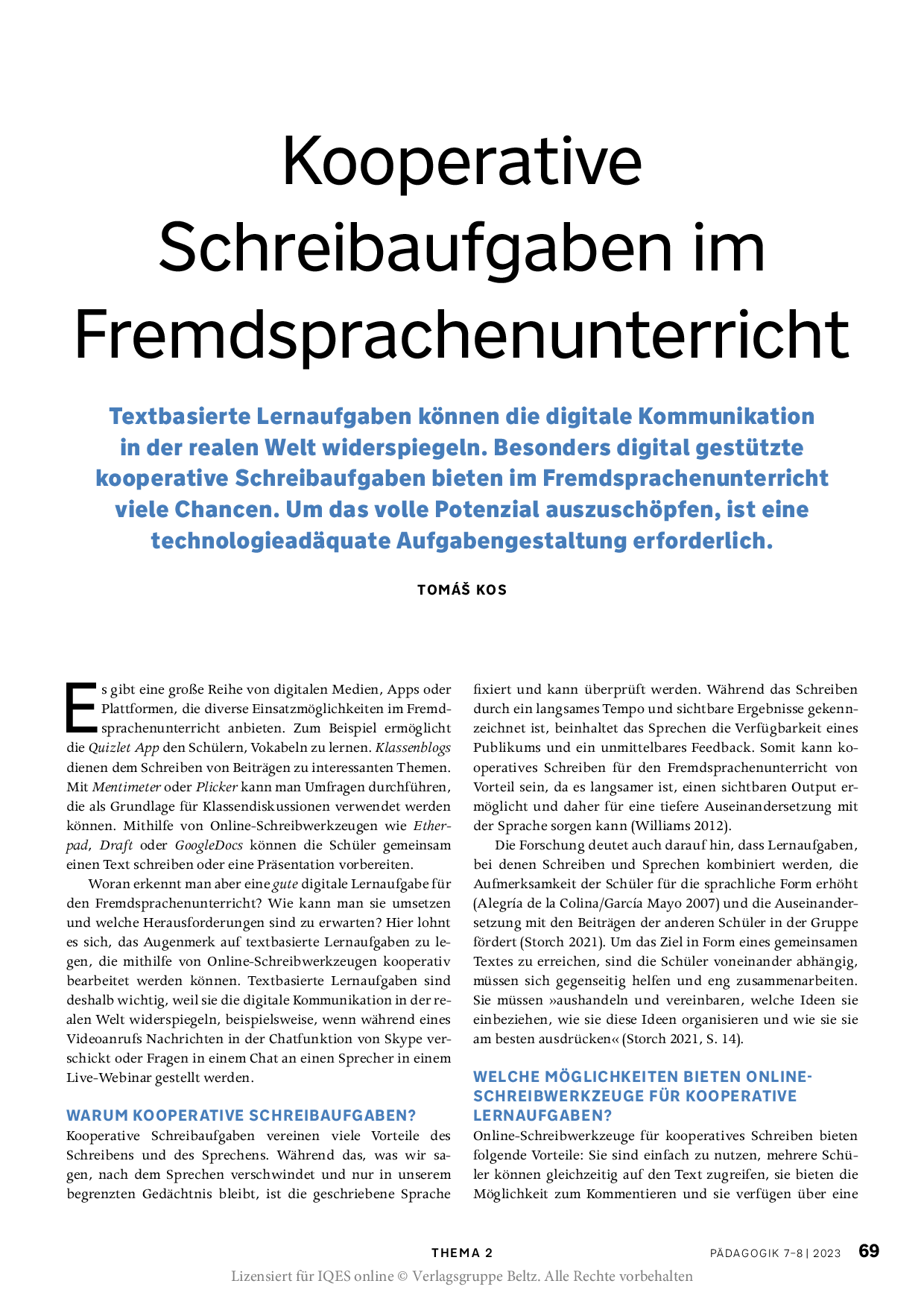 Textbasierte Lernaufgaben können die digitale Kommunikation in der realen Welt widerspiegeln. Besonders digital gestützte Kooperative Schreibaufgaben bieten im Fremdsprachenunterricht viele Chancen. Um das volle Potenzial auszuschöpfen, ist eine technologieadäquate Aufgabengestaltung erforderlich.