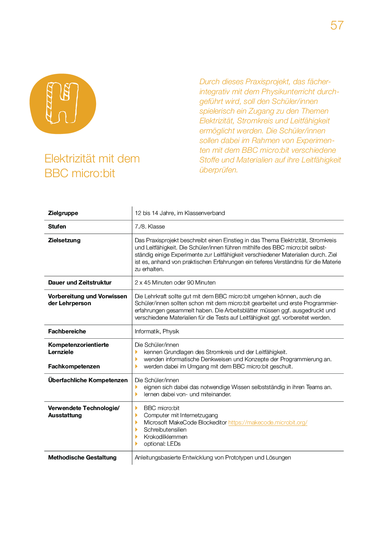 Durch dieses Praxisprojekt, das fächerintegrativ mit dem Physikunterricht durch- geführt wird, soll den Schüler/innen spielerisch ein Zugang zu den Themen Elektrizität, Stromkreis und Leitfähigkeit ermöglicht werden. Die Schüler/innen sollen dabei im Rahmen von Experimenten mit dem BBC micro:bit verschiedene Stoffe und Materialien auf ihre Leitfähigkeit überprüfen.