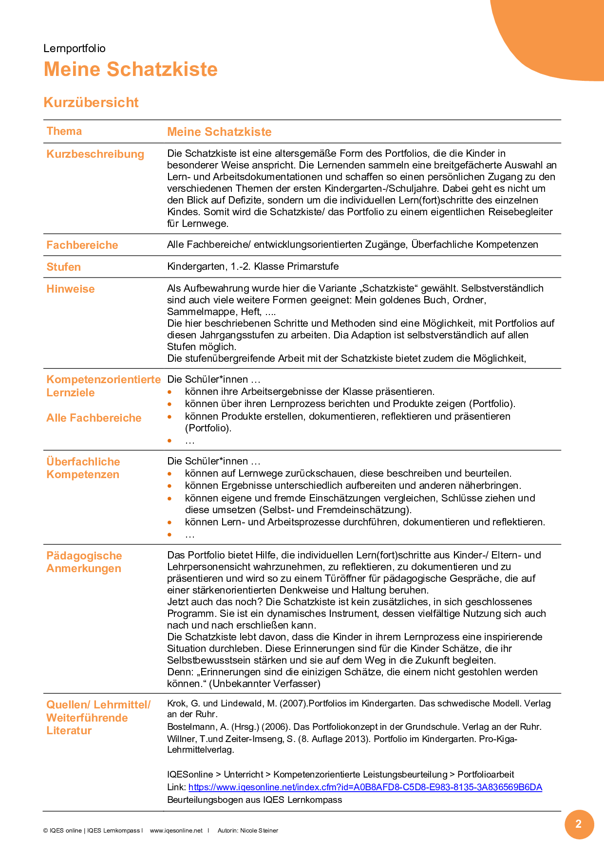 Diese Einführung zum Lernentwicklungsportfolio »Meine Schatzkiste« bietet eine kurze Übersicht, führt in die Grundlagen der Portfolioarbeit ein und zeigt 5 Schritte für die Umsetzung in die Praxis: eine kompetenzorientierte Form von stärken- und ressourcenorientiertem Umgang mit den individuellen Entwicklungs- und Lern(fort)schritten von Kindern.