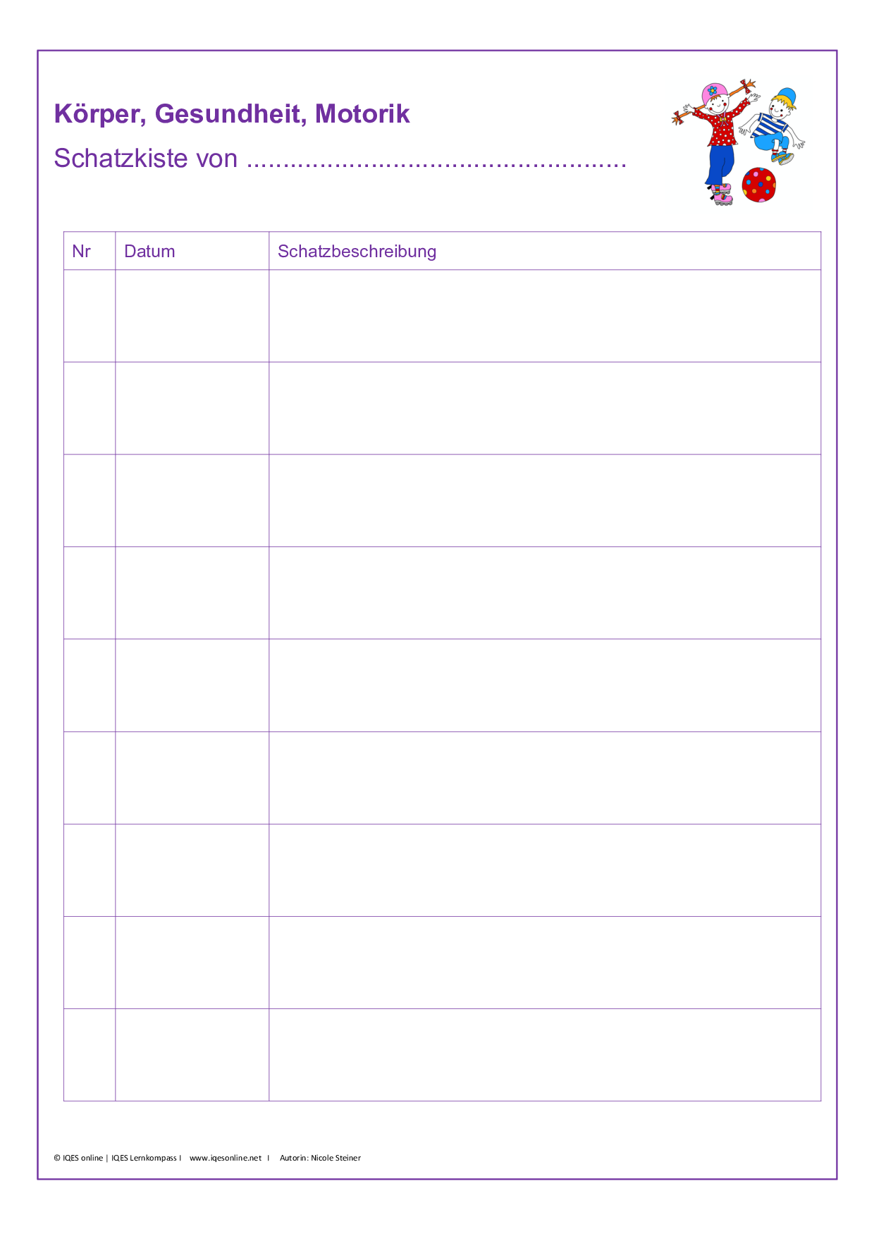 Diese Kopiervorlagen dienen als Sammel- und Übersichtsblätter für die Inhalte der Schatzkiste und können individuell verwendet und gestaltet werden. Sie sollen eine schnelle Übersicht über die Inhalte der Schatzkiste ermöglichen, indem diese pro entwicklungsorientiertem Zugang aufgelistet/ visualisiert werden. Entweder alle auf einer Seite oder aber pro Schatz auf einer Seite.