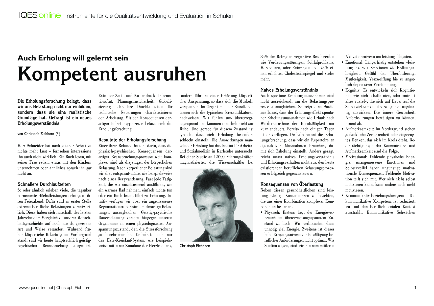 Da wir in der heutigen Arbeitswelt hauptsächlich geistigen und psychischen Beanspruchungen ausgesetzt sind, müssen wir lernen, uns zu erholen. Der Artikel von Christoph Eichhorn thematisiert die Erholungskompetenz.