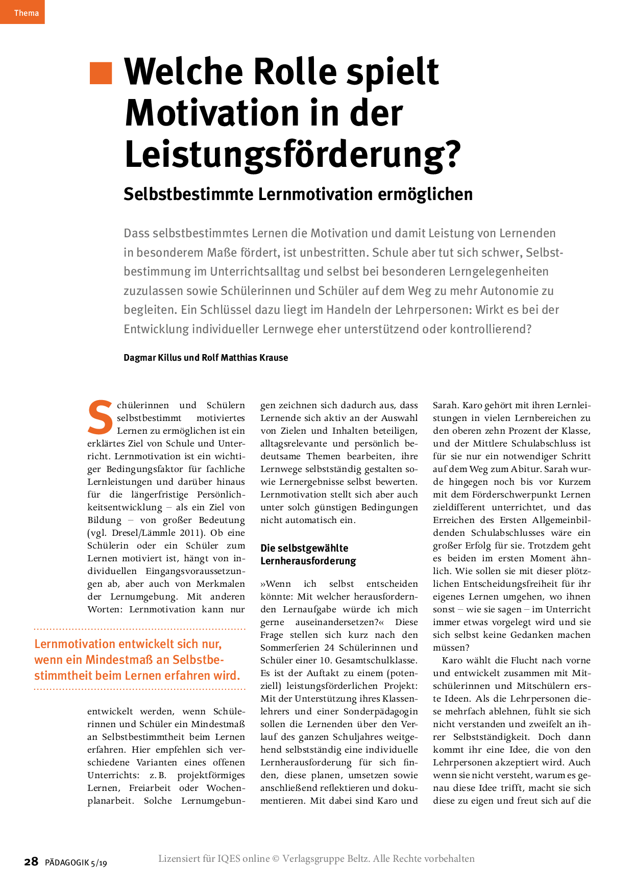 Quelle: Killus, D., Krause, R. M.: Welche Rolle spielt Motivation in der Leistungsförderung? PÄDAGOGIK 5/19, S. 28-31