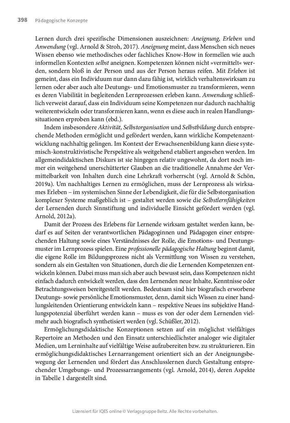 Aus Sicht der systemisch-konstruktivistischen Didaktik gilt der Grundsatz, dass der Mensch zwar lernfähig, zugleich aber auch unbelehrbar ist. Die Ermöglichungsdidaktik setzt ihren Fokus deshalb auf das Individuum mit seinen subjektiven Entwicklungs- und Lernprozessen. Die Selbststeuerung der Lernenden steht dabei im Mittelpunkt, sodass Pädagog*innen nicht (be-)lehrend, sondern begleitend agieren sollten, um selbstständiges Lernen auch tatsächlich zu ermöglichen. Rolf Arnold & Michael Schön beschreiben in ihrem Beitrag Gestaltungsprinzipien von Lernarrangements, die lebendiges und nachhaltiges Lernen fördern. Lehrpersonen, die sich als Lernbegleiter*innen verstehen, versuchen gezielt, die Selbstwirksamkeitsgefühle und das Selbstbewusstsein der Lernenden aktiv zu stärken. Ihre Aufgabe liegt primär darin, analoge wie auch digitale Lernräume so zu gestalten und arrangieren, dass diese bei den Lernenden SPASS wecken. Das Akronym SPASS steht dabei für die Kriterien selbstgesteuert, produktiv, aktivierend, situativ und sozial.