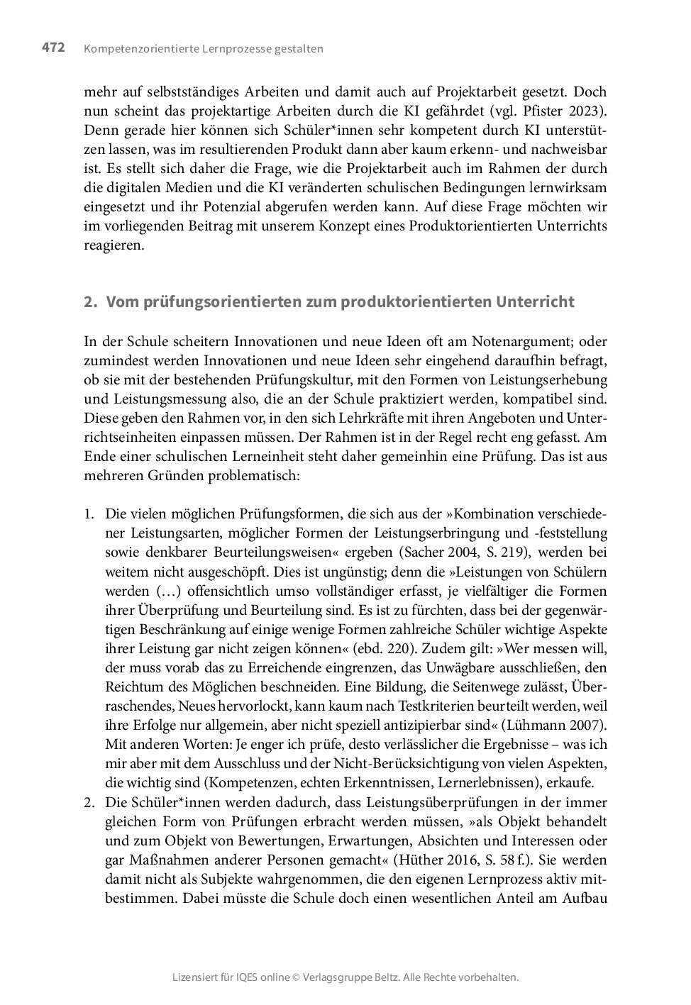 Während im herkömmlichen Unterricht Prüfungen den Abschluss einer Einheit markieren, plädieren die beiden Autoren für Leistungsüberprüfungen in Form von Produkten: diese werden nach der Fertigstellung in den Unterricht getragen, werden präsentiert, gesichtet, besprochen und evaluiert. Im besten Fall resultiert ein Produkt, das die verdiente Aufmerksamkeit bekommt und der Klasse als echte Lernressource dient. Um Produkte dieser Art herzustellen, brauchen die Schüler*innen konkretes, verfügbares Fachwissen, spezifische Fertigkeiten, Motivation und Durchhaltevermögen. Sie bauen Kompetenzen auf, indem Wissen und Können praktisch angewendet werden: Probleme werden gelöst und die eigenen Lernprozesse dabei bewusst erlebt und gesteuert. Insbesondere sind auch Kompetenzen im Umgang mit digitalen Medien gefragt, weil sich neue Medien besonders gut für die Herstellung, die gemeinsame Bearbeitung und den Austausch von Lernprodukten eignen.