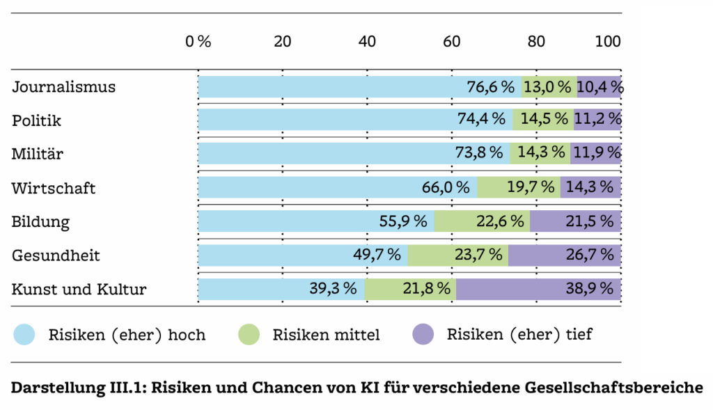 Vor allem im Journalismus sehen viele Menschen Risiken durch den Einsatz von KI. In derselben Befragung sind 67,1% der Befragten der Meinung, dass bei einem zunehmenden Einsatz von KI in der Nachrichtenproduktion vermehrt Falschnachrichten in der Berichterstattung auftauchen würden.