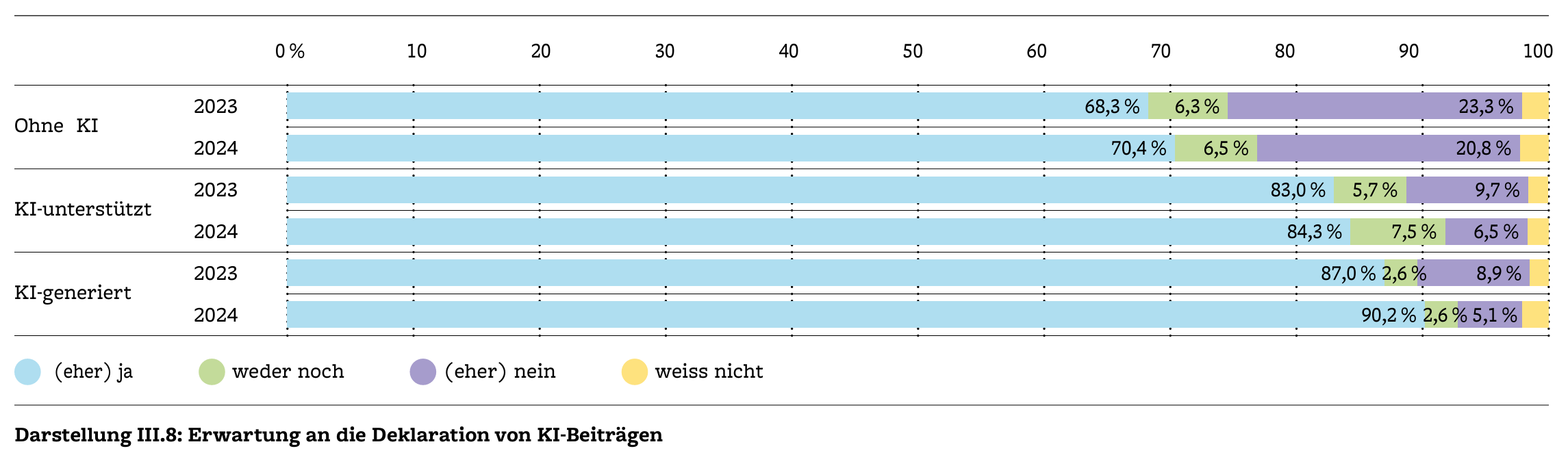 Für die Untersuchung haben über 1200 Menschen verschiedene Fragen zu KI und Medien beantwortet. Die Befragung zeigt: Die Mehrheit möchte, dass der Einsatz von KI (hier in den Medien) klar ausgewiesen wird. Die Menschen wollen wissen, ob die Inhalte, die sie lesen, sehen oder hören, mithilfe von KI erstellt wurden.