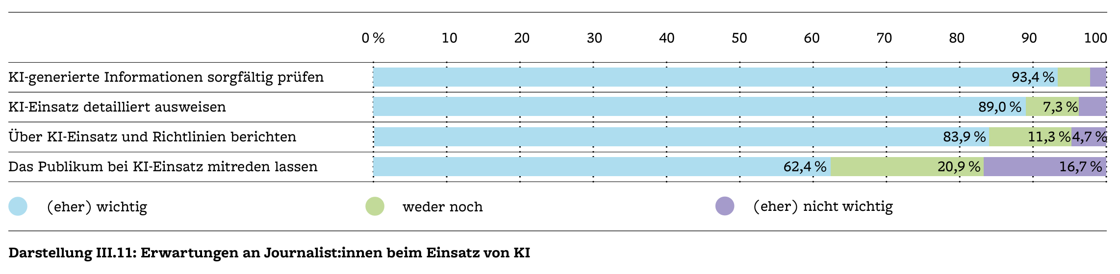 Lesebeispiel: 93,4 % der Befragten geben an, es sei ihnen wichtig, dass Journalist:innen sorgfältig die Informationen prüfen, die durch KI generiert wurden.