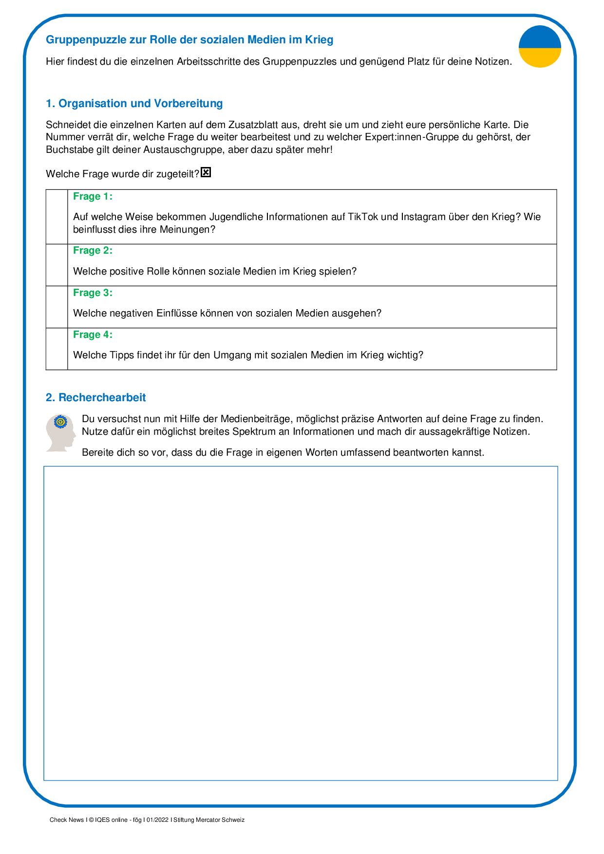 Vorstellen: Stellt anschliessend in der Klasse eure Gruppenergebnisse vor. Sammelt Fragen und Feststellungen für die weitere Vertiefung in dieser Lernumgebung «Medien im Krieg».