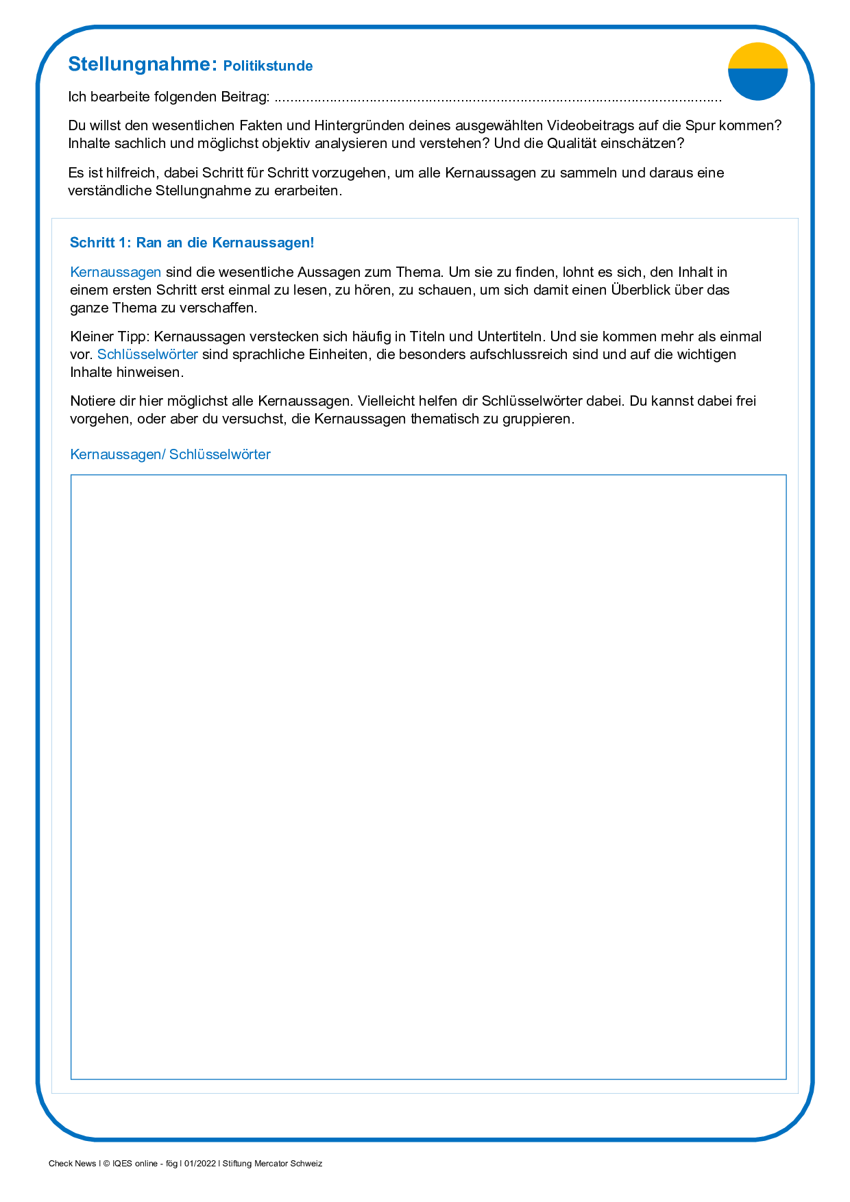 Anschliessend gestaltet ihr eine eigene «Politikstunde» als Videobeitrag oder Podcast. Dadurch, dass ihr alle vier Beiträge kombiniert, wird es möglich, den Krieg in der Ukraine aus verschiedenen Blickwinkeln zu verstehen.