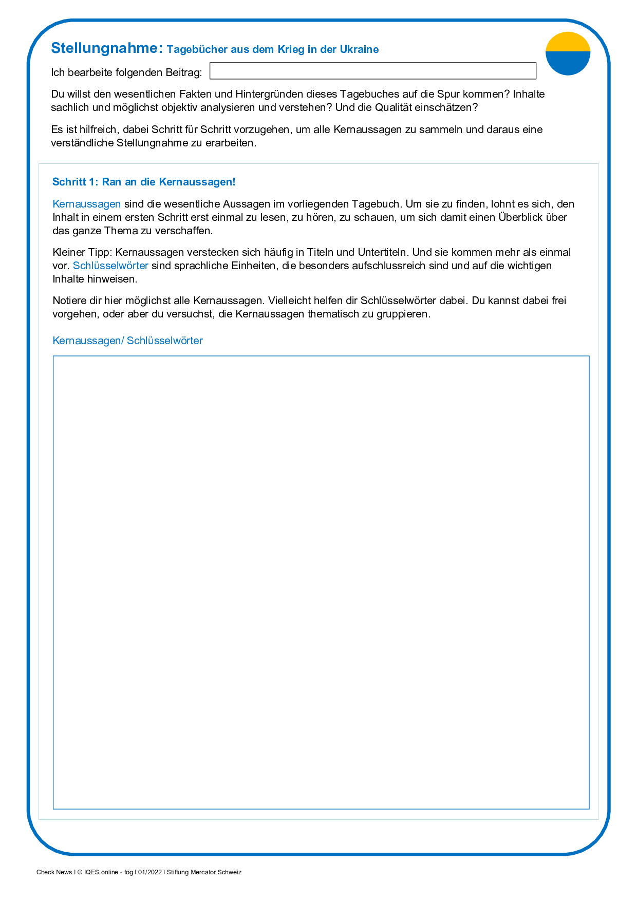 Vertiefe dich in deinen Beitrag, halte deine Eindrücke fest und analysiere dein Tagebuch mit Hilfe der Leitfragen der Vorlage «Tagebücher aus dem Krieg».