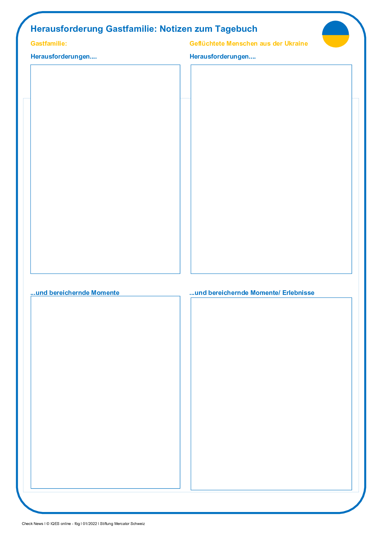 Notiere dir tägliche Herausforderungen, aber auch bereicherne Momente, die sich sowohl für die Gastfamilie, als auch für die geflüchteten Menschen aus der Ukraine ergeben.
