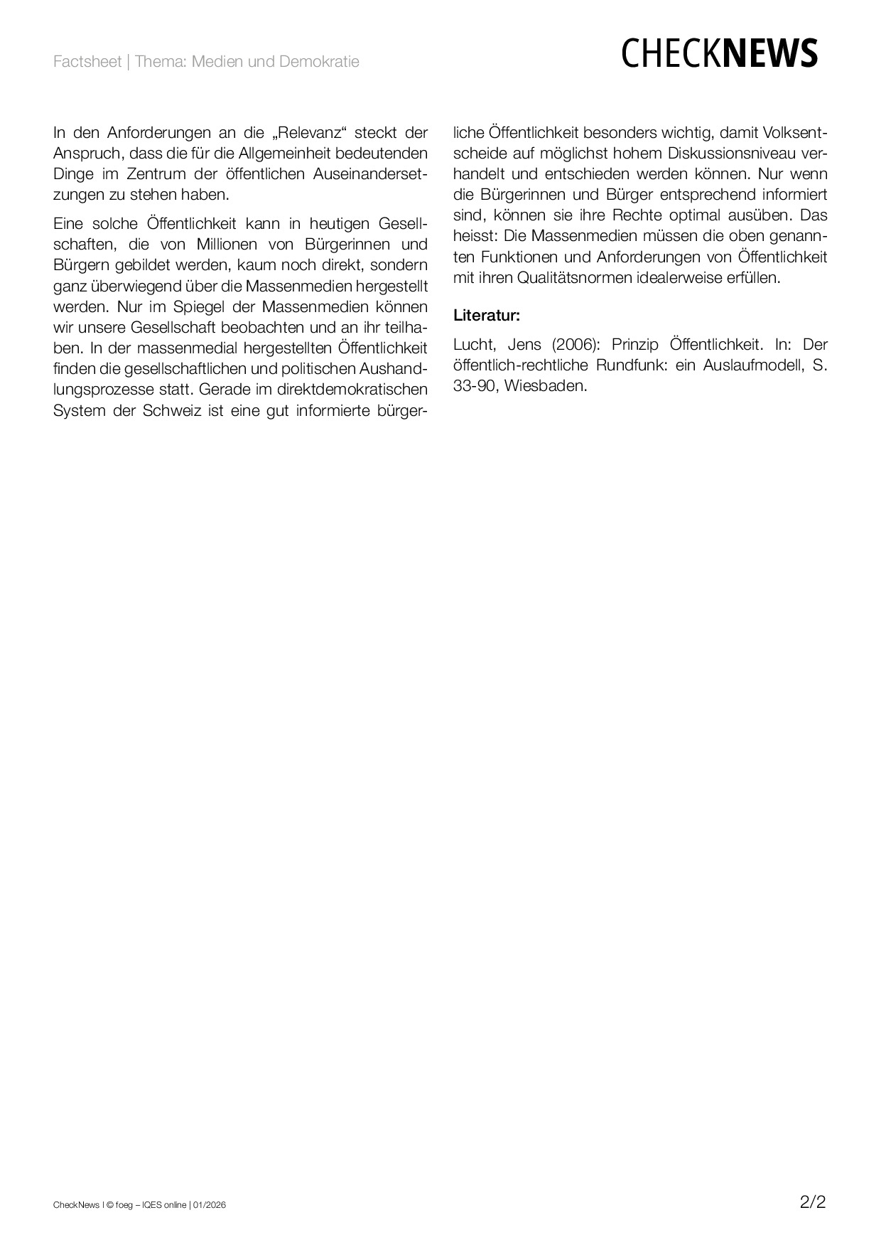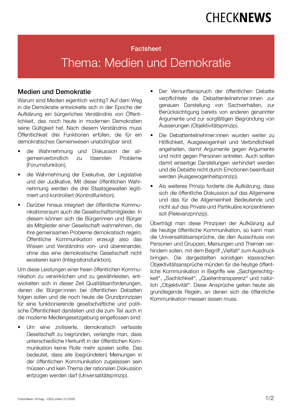 Die Factsheets zeigen dir kompaktes Wissen aus der Medienwelt – ohne Fachchinesisch und auf den Punkt gebracht. Du erfährst, warum professionelle journalistische Medien für unsere Gesellschaft wichtig sind und was sie von anderen Angeboten unterscheidet. Sie helfen dir auch dabei, die Qualität verschiedener Medien besser einzuschätzen: Welche Informationen sind zuverlässig, wo wird sauber recherchiert. So kannst du auch Posts, Clips und andere digitale Kanäle bewusster und kritischer nutzen.