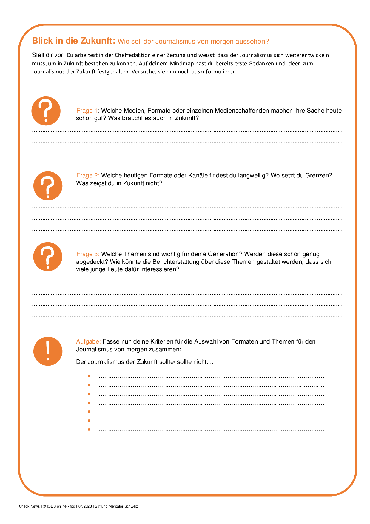 Als Chefredakteur:in beschäftigt dich also das Thema, wie dein Medium auch in Zukunft die Leute erreicht. Nimm auf dem Arbeitsblatt »Blick in die Zukunft« Stellung zu dieser verantwortungsvollen Aufgabe.