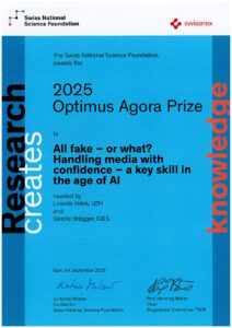 Unser CheckNews-Projekt »All fake – or what? Handling media with confidence – a key skill in the age of AI« hat 2025 einen renommierten Preis gewonnen: den »Prix Optimus Agora« des Schweizerischen Nationalfonds SNF in Zusammenarbeit mit Swissnex. Der Preis unterstützt »herausragende« Projekte, die »einen direkten Dialog zwischen Wissenschaft und Gesellschaft ermöglichen«.