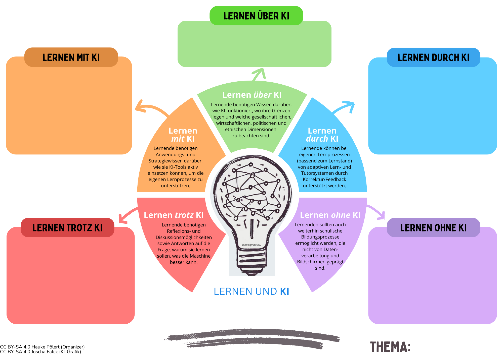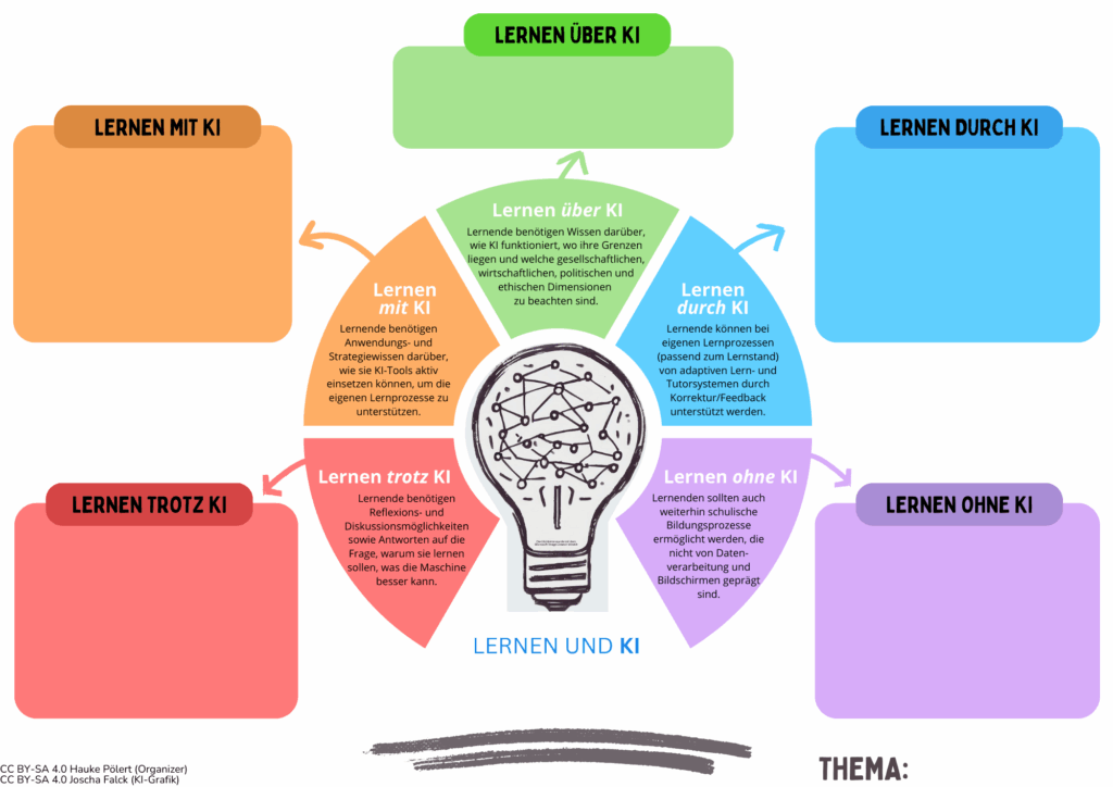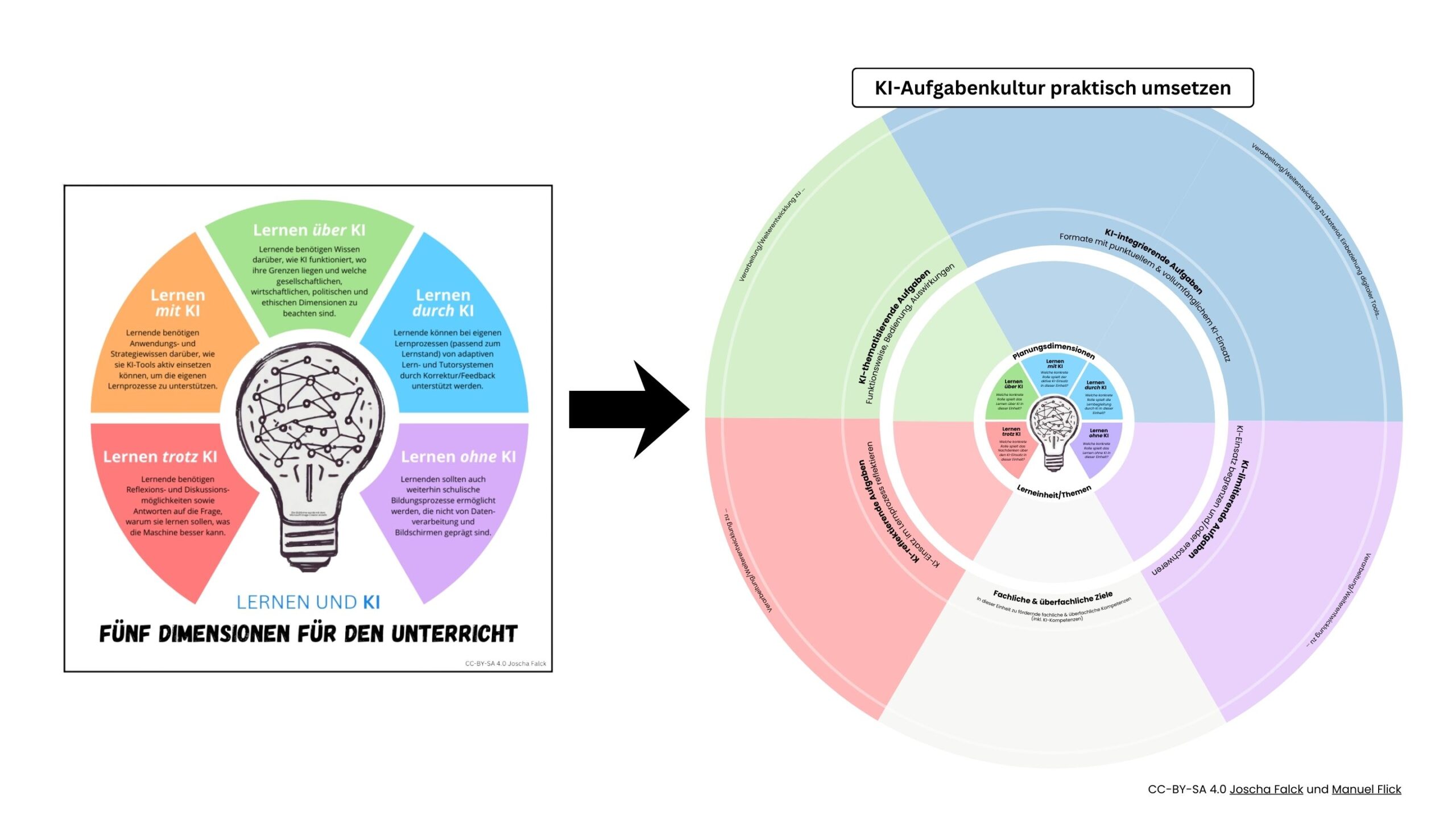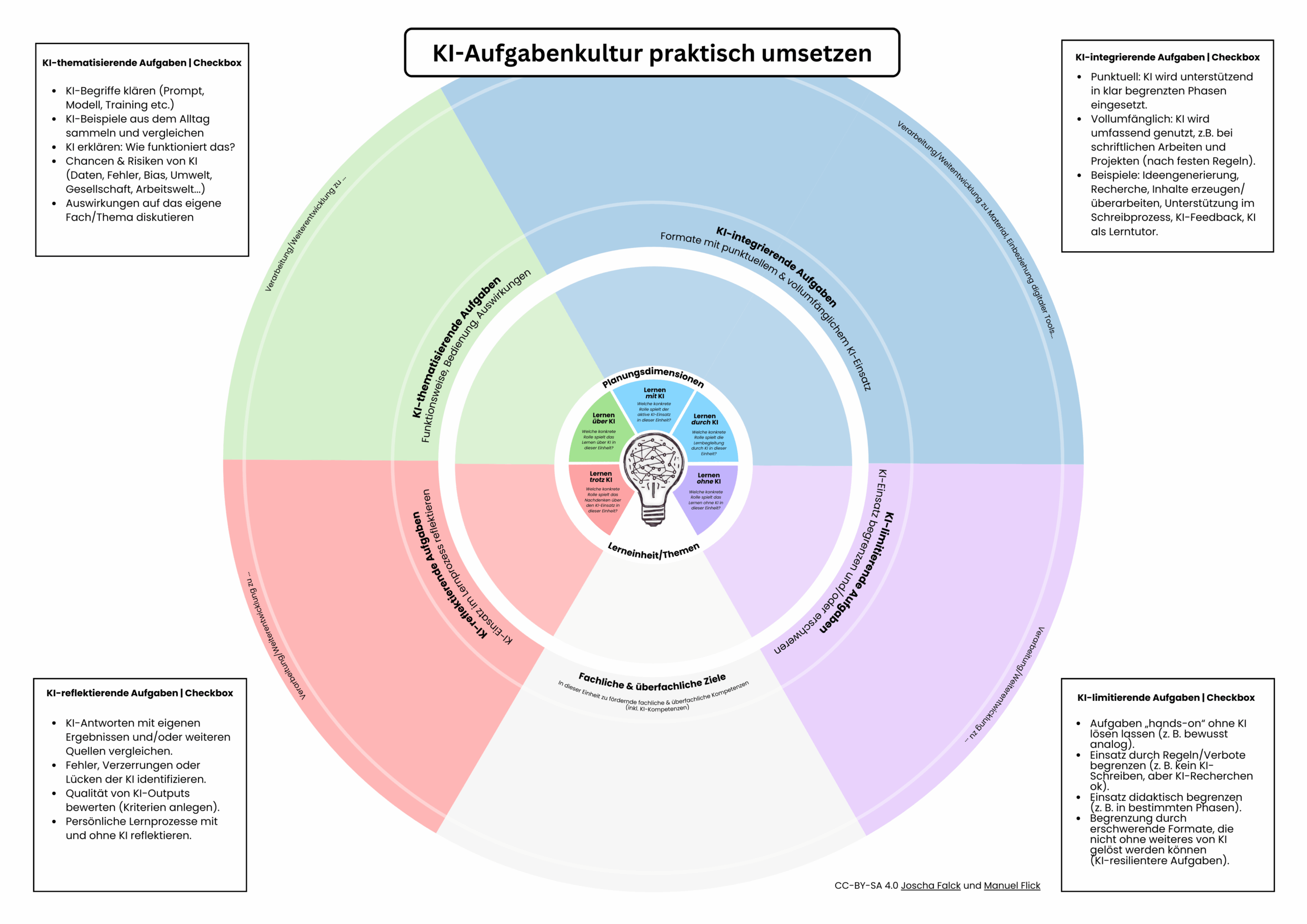 Diese Dimensionen waren jedoch ursprünglich nicht als didaktische Schablone gedacht, um Unterricht und Aufgaben im KI-Zeitalter systematisch zu planen. Dennoch zeigte sich schnell, dass sie auch in diesem Sinne genutzt wurden. Mit einer konkreten Unterrichtseinheit vor Augen ließ sich strukturieren, was ohne KI erlernt werden soll, wo KI sinnvoll eingesetzt werden kann und welche Aspekte der Technologie selbst thematisiert werden müssen. Dankenswerterweise hat Hauke Pölert die ursprüngliche Grafik später zu einer Postervorlage erweitert, die für analoges Arbeiten in Fachschaften und Unterrichtsteams eingesetzt werden kann.