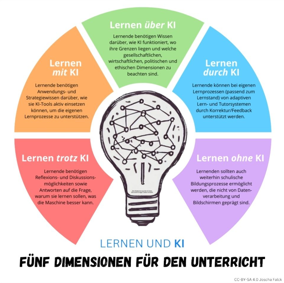 Die 5 Dimensionen „Lernen und KI von Joscha Falck (2023) haben sich im bildungsbezogenen KI-Diskurs als zentrale Orientierungshilfe etabliert. Das Modell unterscheidet Lernen über, mit, durch, trotz und ohne KI und bietet damit einen klaren Rahmen, um den Einsatz von KI im Unterricht systematisch zu reflektieren und den sich verändernden Bildungsauftrag zu umreißen.