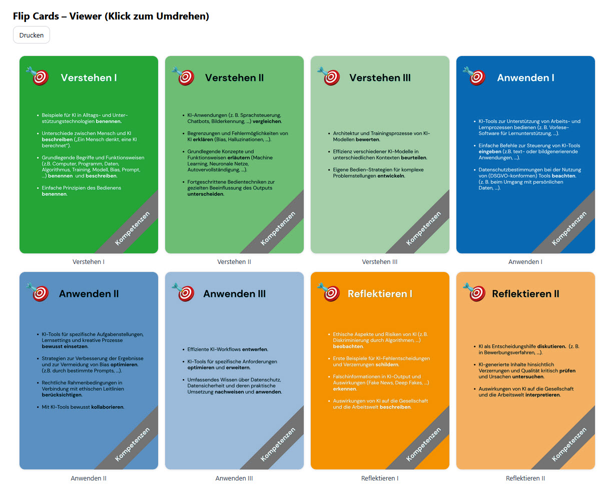 Das Flipcard-Tool übersetzt die vier KI-Kompetenzbereiche in unmittelbar einsetzbare Unterrichtsbeispiele. In Form digitaler Karten erhalten Lehrkräfte strukturierte Aufgaben, Abläufe und Reflexionsimpulse für unterschiedliche Fächer und Niveaus.