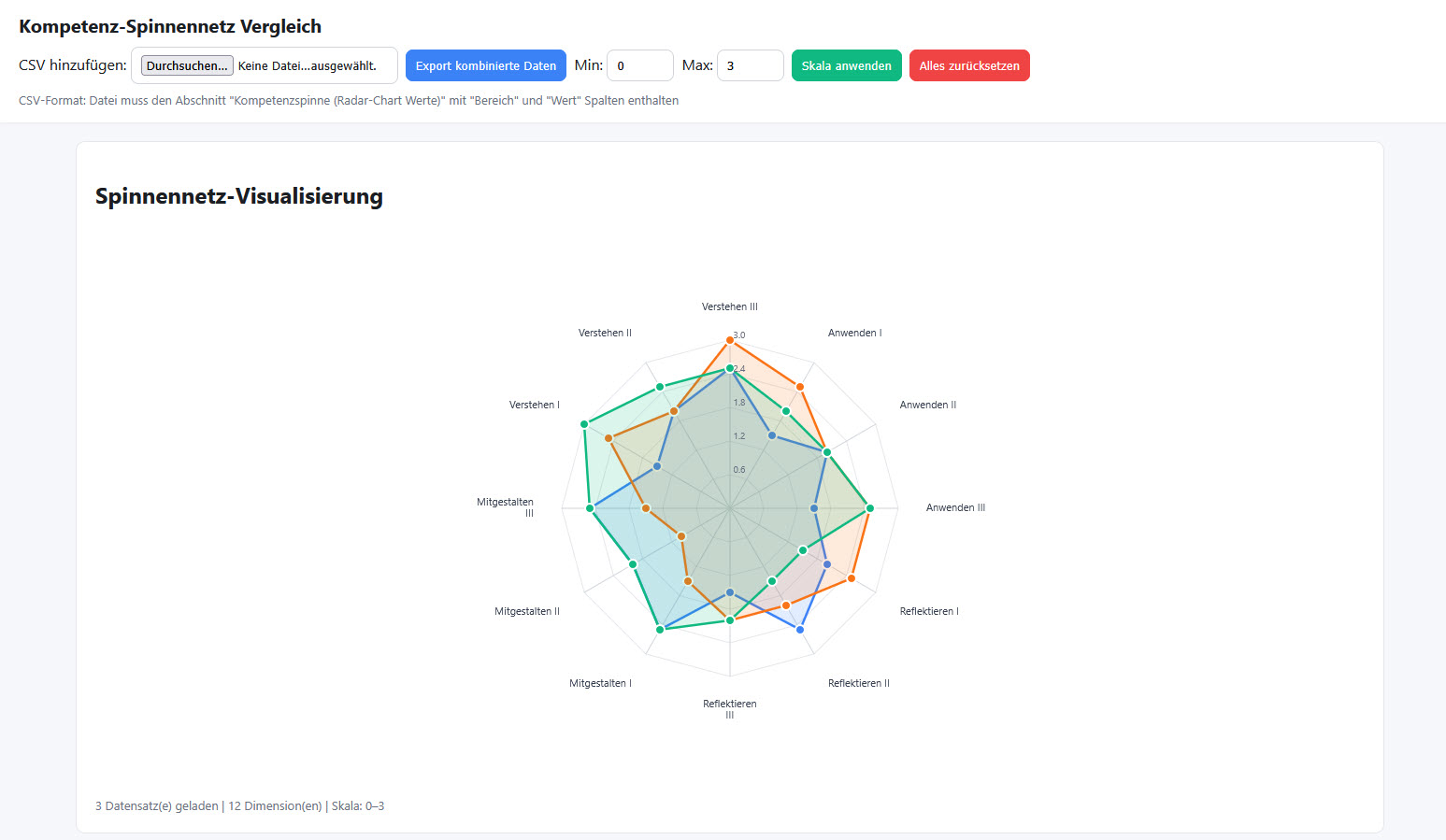 Das Vergleichstool übersetzt die Ergebnisse des KI-Kompetenz-Analyzers in überlagerbare Spinnennetzdiagramme und macht individuelle wie kollektive Kompetenzprofile auf einen Blick sichtbar. Es zeigt Stärken, Entwicklungsbedarfe und Veränderungen über die Zeit – für Einzelpersonen, Teams oder ganze Kollegien. So wird KI-Kompetenzentwicklung transparent, datenbasiert und gezielt für Unterrichts- und Schulentwicklung nutzbar.