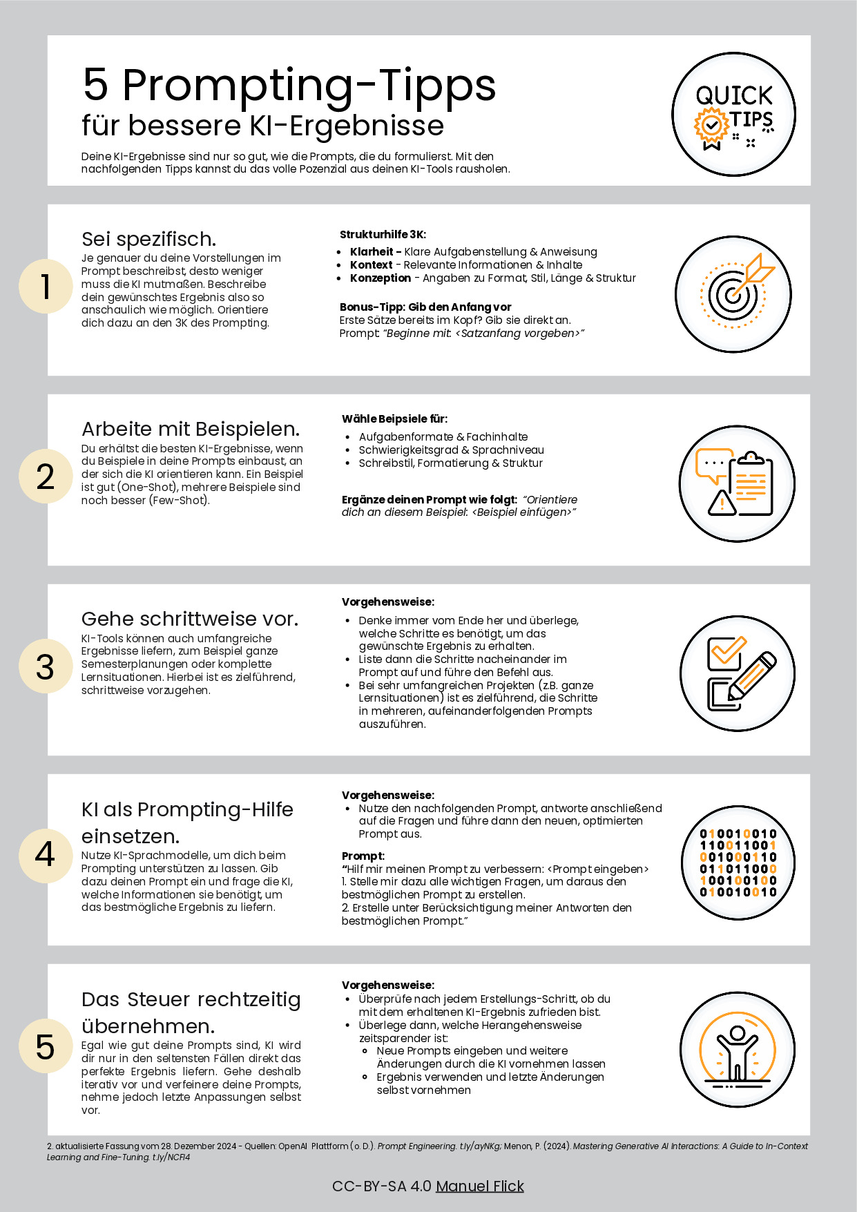 Eure KI-Ergebnisse sind nur so gut wie die Prompts, die ihr formuliert. Mit diesen fünf Tipps könnt ihr mehr aus euren KI-Tools herausholen. Ob ihr spezifische Prompts formuliert, mit Beispielen arbeitet, schrittweise vorgeht, die KI als Prompting-Hilfe nutzt oder rechtzeitig selbst die Kontrolle übernehmt – ihr habt jetzt das Handwerkszeug, um bessere KI-Ergebnisse zu erzielen. Dabei müssen nicht immer alle Tipps auf einmal angewandt, sondern können je nach Aufgabenstellung und Anforderung punktuell eingesetzt werden.