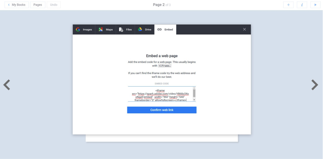 3. Gehen Sie dann zu Book Creator in Ihrem Chrome-Webbrowser und öffnen Sie die Seite, auf der Sie das Video zeigen möchten. Tippen Sie auf das Pluszeichen oben auf der Seite und wählen Sie die Option »Import«. Dann sehen Sie die Option »Embed«, über die Sie den iFrame-Code hinzufügen können, um Ihr Video in das E-Book einzubetten. In drei Schritten ist der Prozess beendet und das Video fertig eingebunden. Wird das E-Book jetzt abgespielt oder als Video exportiert, wird auch das eingebettete Video automatisch erkannt.