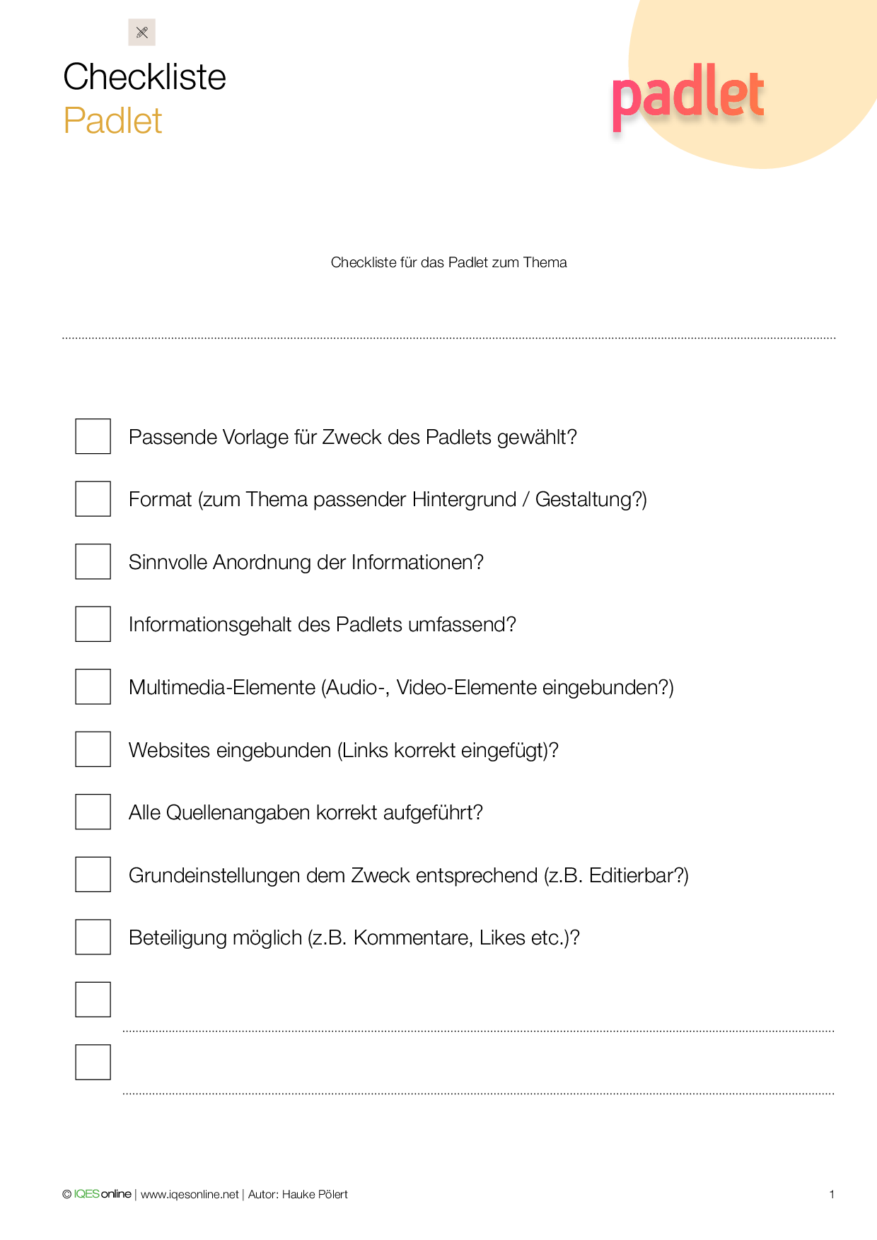 - Gemeinsam lässt sich besprechen, wie eine übersichtliche Padlet-Seite aussehen könnte. Hier kann eine Checkliste, welche auch durch eigene Kriterien ergänzt werden kann, helfen.