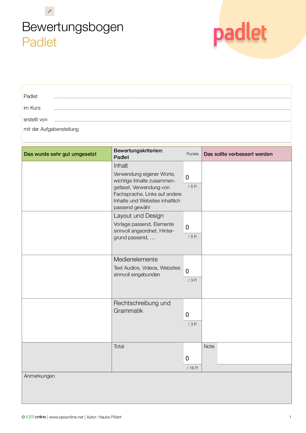 - Der Erarbeitung sollte zunächst eine Phase der Selbstreflexion und -bewertung folgen, in der die SuS ihre eigene Leistung hinterfragen und sich – falls es relevant und zielführend ist – über gelungene und verbesserungswürdige Inhalte ihres Padlets klar werden können.