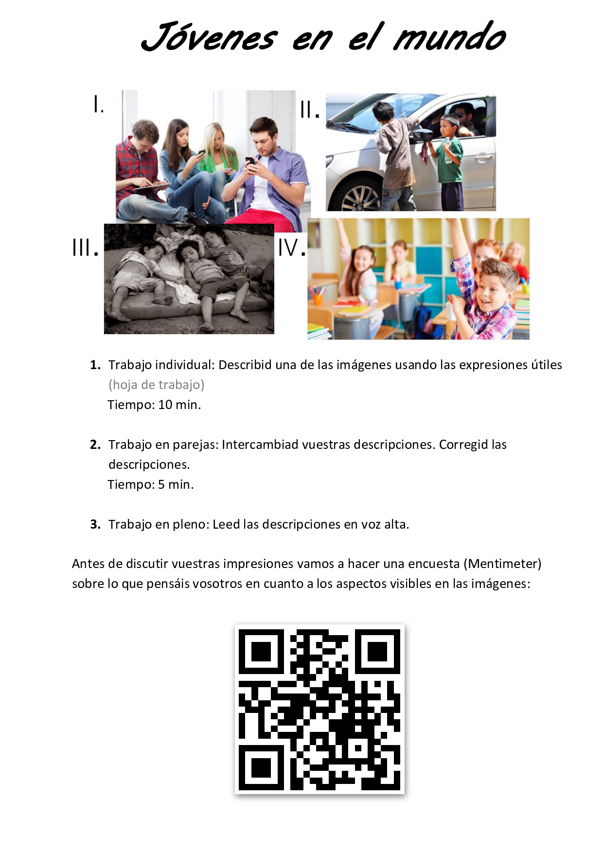 QR-Codes für den einfachen Einstieg in kollaborative Tools und interaktive Präsentationen: Die meisten interaktiven bzw. kollaborativen Tools bieten inzwischen direkten Zugang per QR-Code im Unterricht – meist durch einfaches Klicken auf einen Button wie bspw. «QR Code», so z.B. Mentimeter, Quizlet Live und Answergarden. Die QR-Codes lassen sich aber auch kopieren und in kontextualisierte Arbeitsblätter oder Arbeitsaufträge einfügen. Hier ein Beispiel zum Einstieg in eine Mentimeter-Umfrage während eines Themeneinstieges im Spanischunterricht – nach einer ersten Bildbeschreibung folgt eine Abfrage der persönlichen Einschätzung: