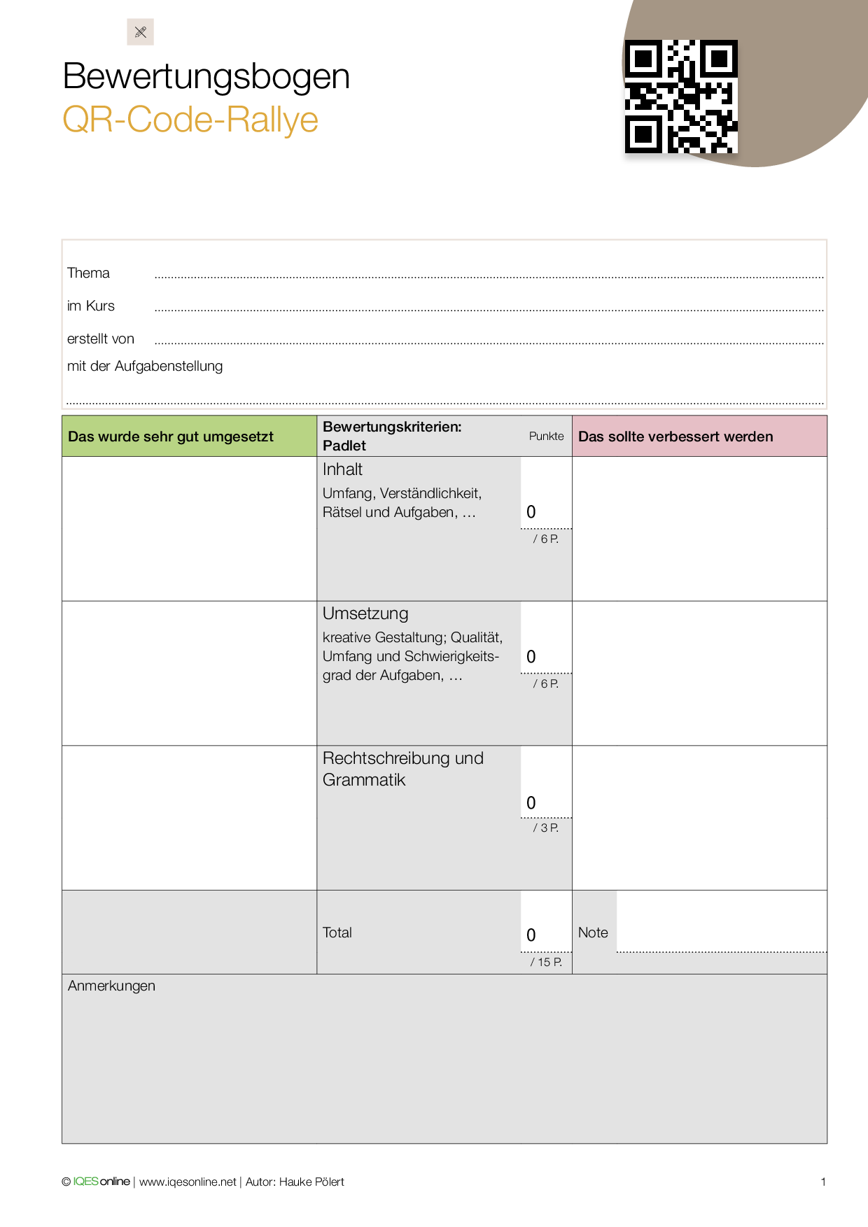 Bewertungsmöglichkeit für das Erstellen einer QR-Code-Rally: Auch eine QR-Code-Rally kann mit einem recht einfachen und themenübergreifend nutzbaren Rückmeldebogen bewertet werden. Neben der inhaltlichen Ebene kommt hier auch die Frage der Umsetzung zum Tragen, die bei einer QR-Code-Rallye ebenfalls mitbewertet werden sollte: Sind die Aufgaben kreativ und für die Teilnehmer lösbar gestaltet? Ist der Aufbau der Rallye schlüssig?
