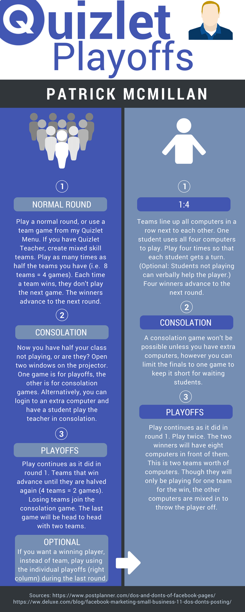Die Ideen und Vorschläge McMillans stellen eine gute Ergänzung zum klassischen Quizlet Live – Spiel dar. Hier sollen einige der Methoden mit freundlichem Einverständnis von Patrick McMillan und nach Übersetzung ins Deutsche vorgestellt werden.
