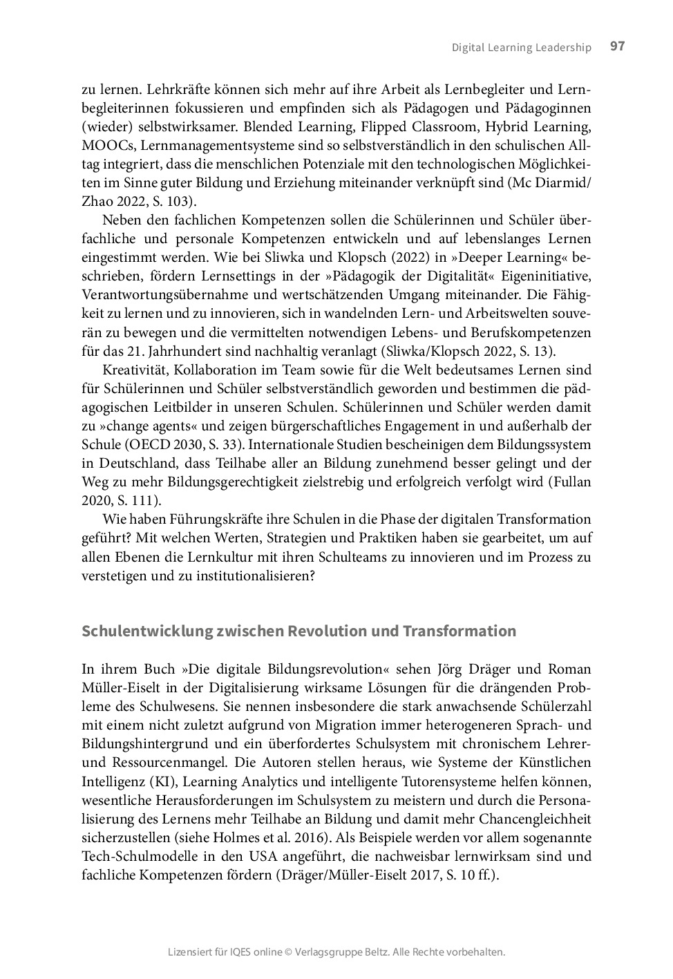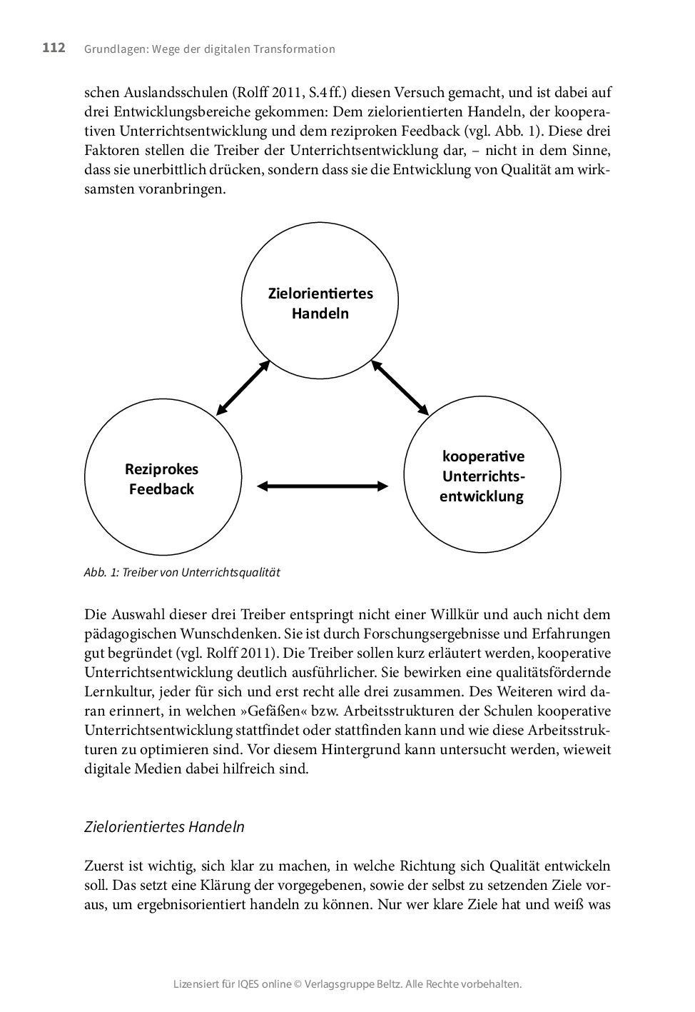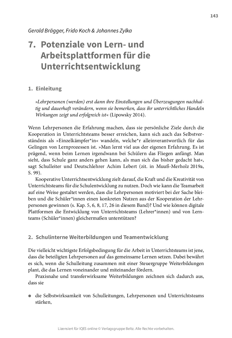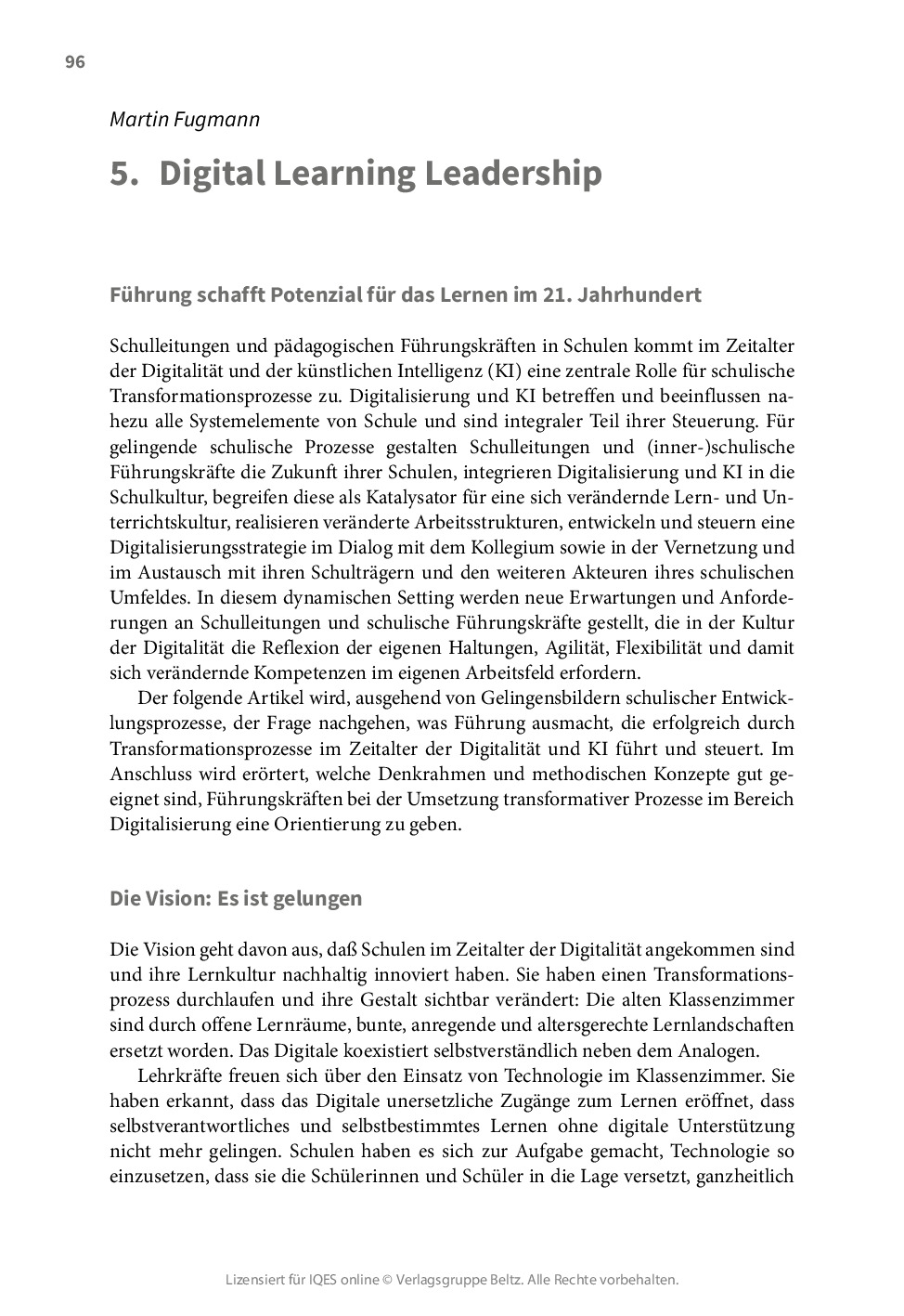 Die Rolle der Schulleitungen wird multiperspektivisch beleuchtet; dabei geht es um Fragen der Infrastruktur (Hardware und Lernplattformen) ebenso wie um Fortbildungsangebote an das Kollegium und der Aufbau einer Evaluations- und Feedbackkultur.