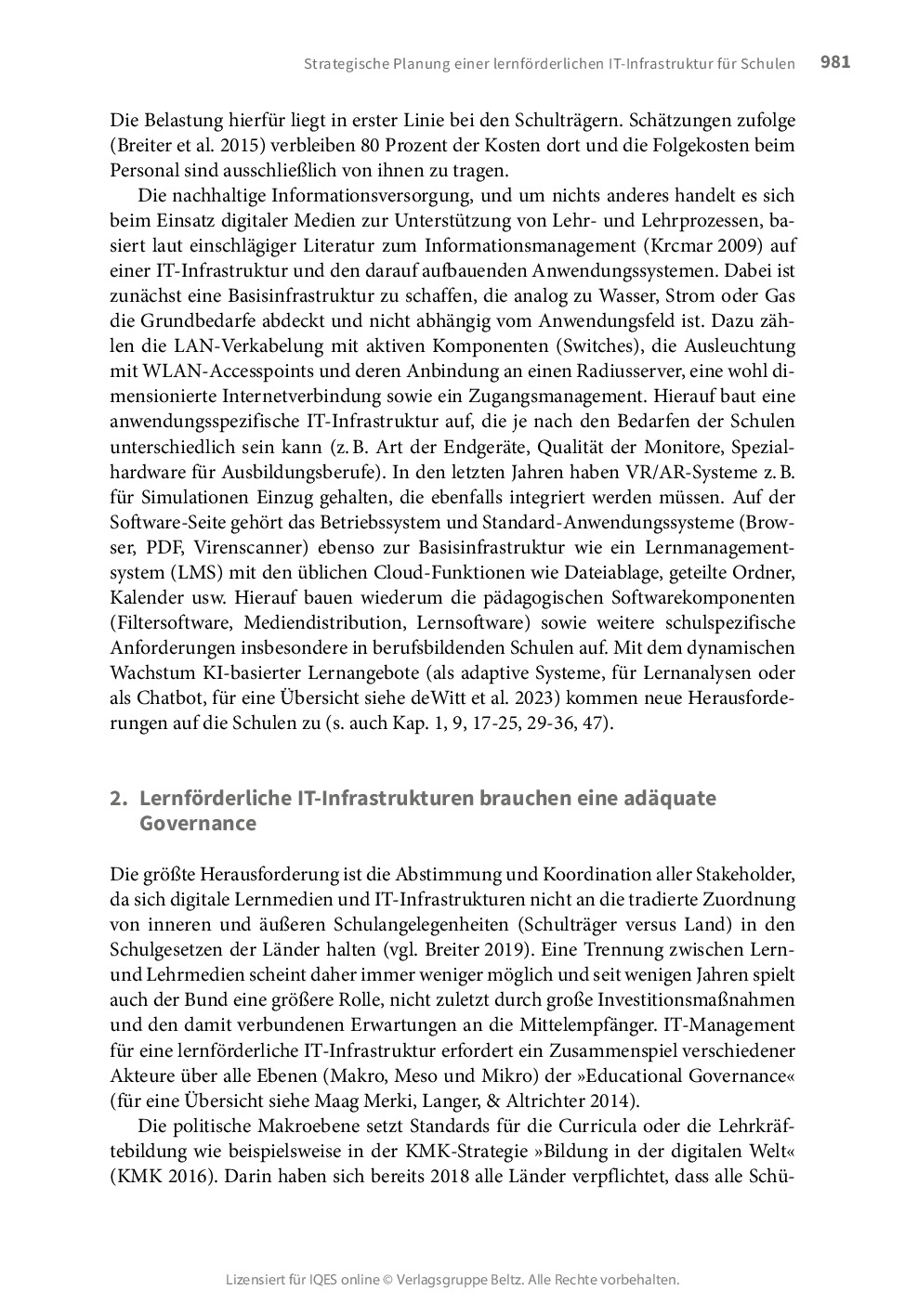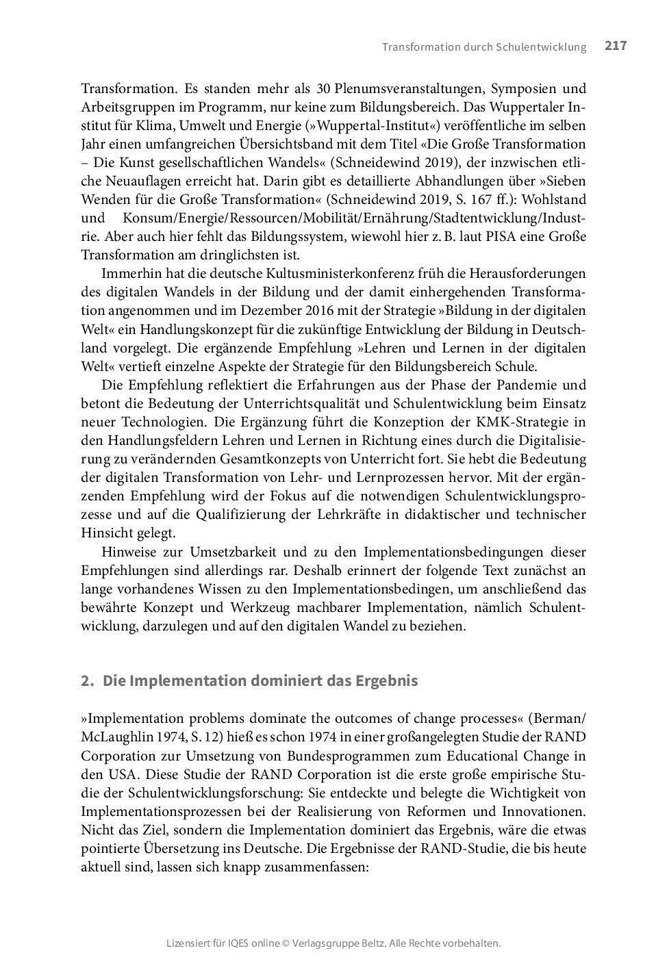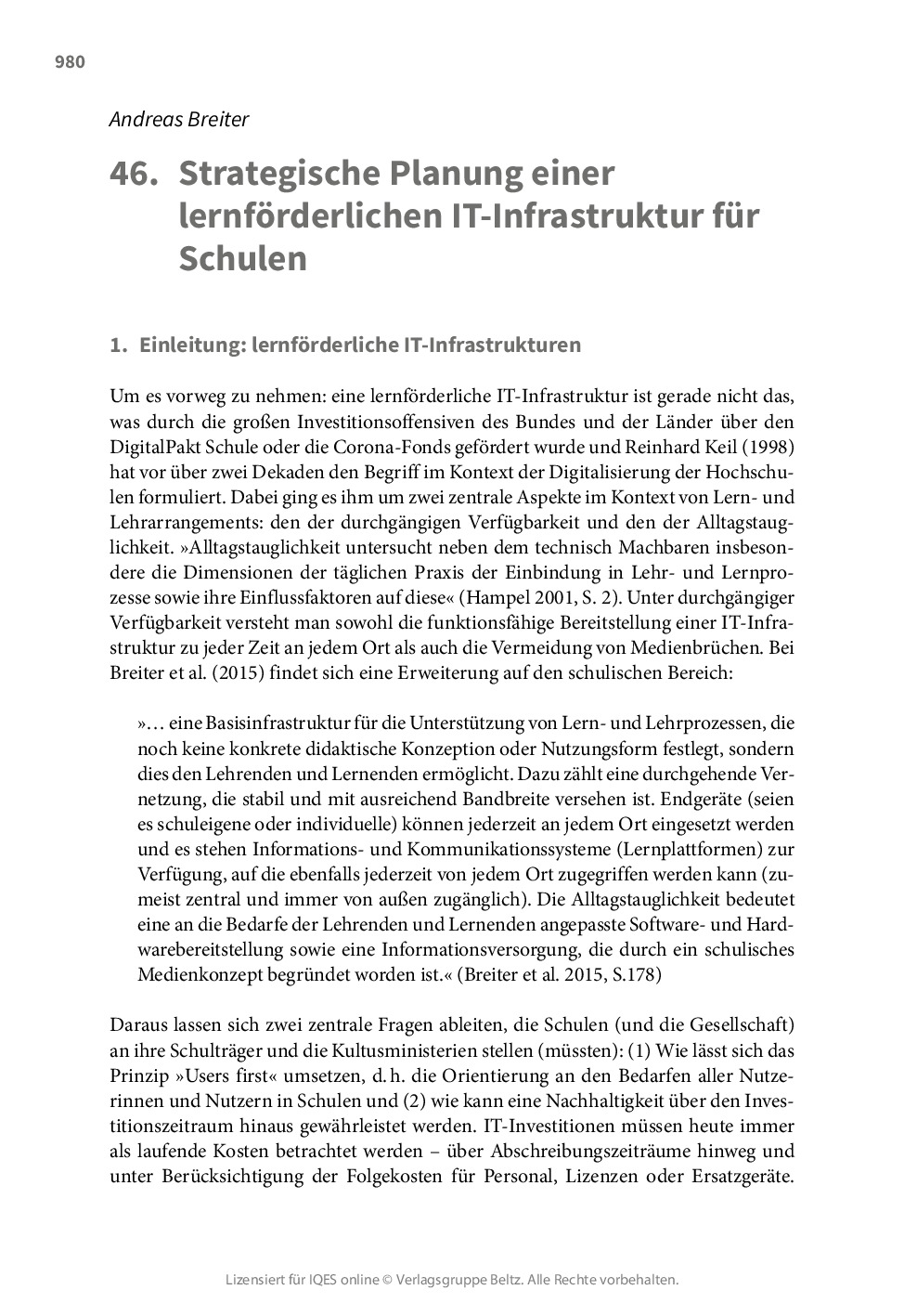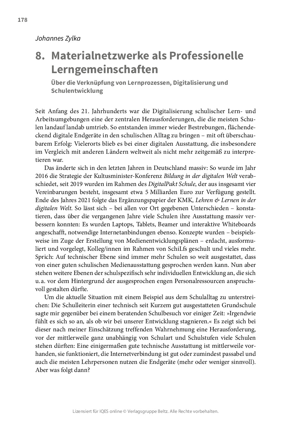 Die Rolle der Schulleitungen wird multiperspektivisch beleuchtet; dabei geht es um Fragen der Infrastruktur (Hardware und Lernplattformen) ebenso wie um Fortbildungsangebote an das Kollegium und der Aufbau einer Evaluations- und Feedbackkultur.
