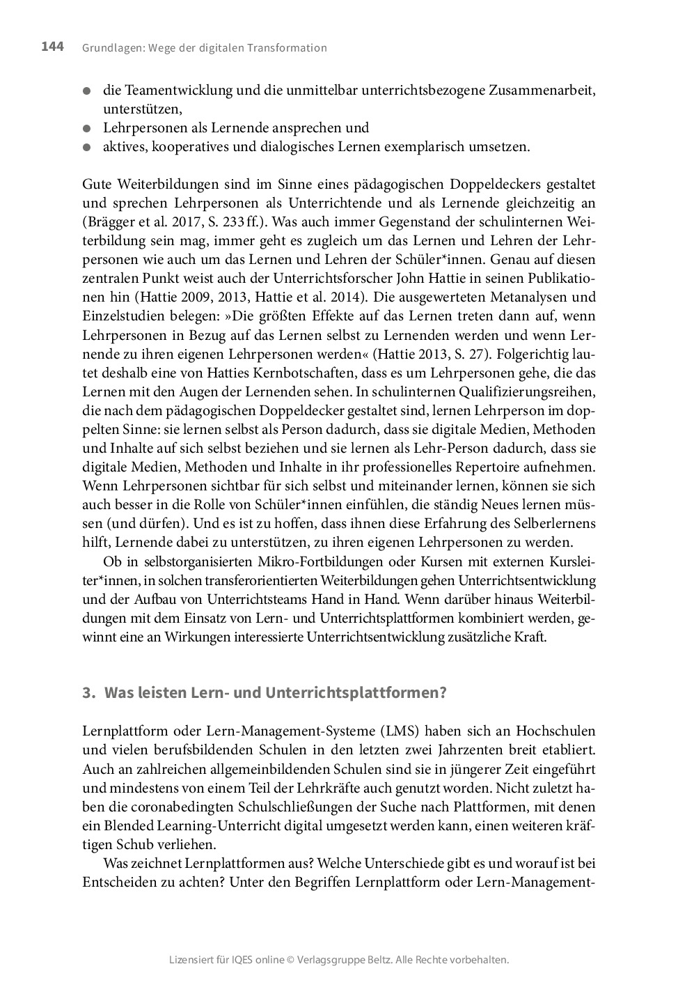 Digitale Lern- und Unterrichtsplattformen haben ein sehr großes, bisher von vielen Schulen nicht oder wenig ausgeschöpftes Potenzial, die Teamarbeit in Schulen zu fördern und den Wandel der Lernkultur voranzubringen. Aufgrund ihre interaktiven Netzwerkfunktionen können sie den Austausch und die arbeitsteilige Kooperation in professionellen Lern- und Arbeitsgemeinschaften erleichtern. Und sie können mit neuartigen, bisher noch nicht dagewesenen Funktionen teamorientierte Unterrichtsentwicklung wirksamer machen und den Schüler*innen näherbringen. Was zeichnet Lern- und Arbeitsplattformen aus? Welche Unterschiede gibt es und worauf ist bei Entscheiden zu achten? Und wie können Unterrichtsteams mit Plattformen schrittweise und erfolgreich eine gemeinsame Praxis des digital gestützten Lernens und Unterrichtens aufbauen und vernetzen?