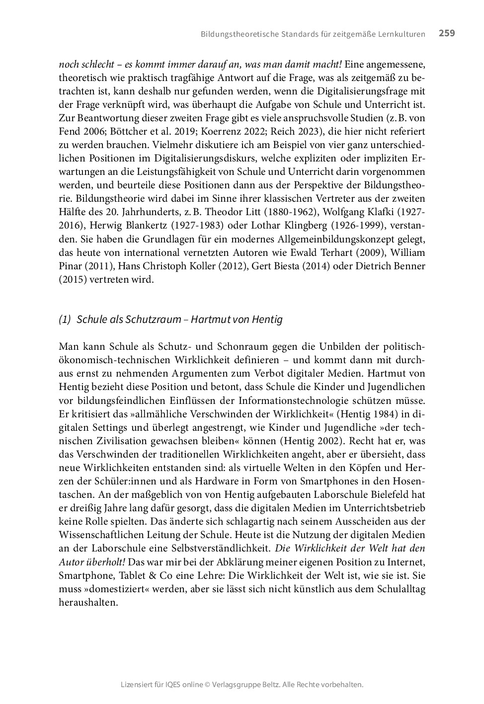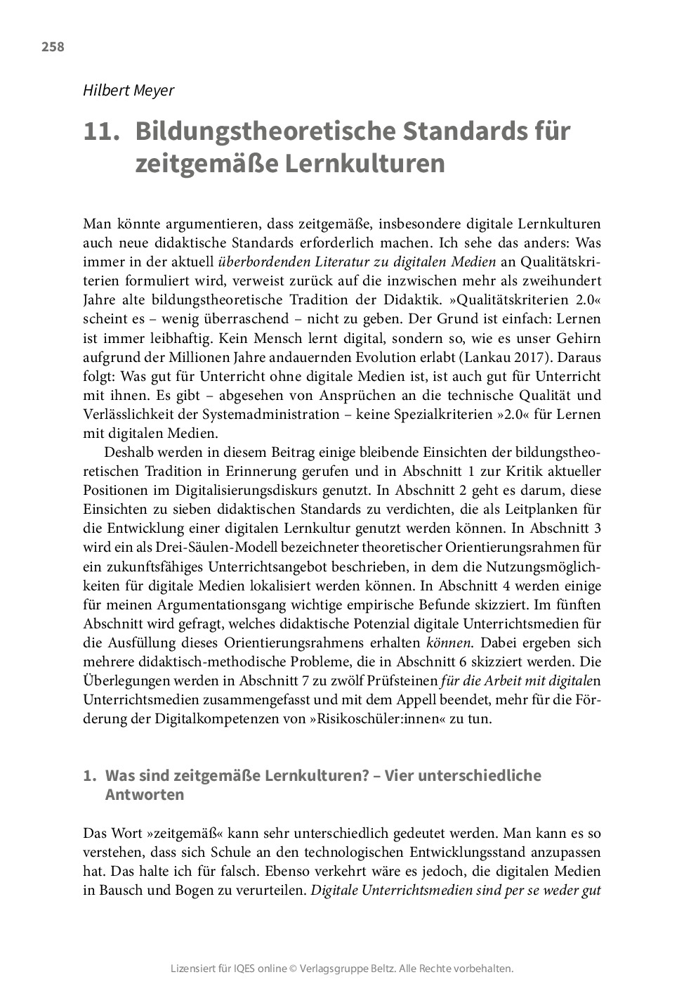Hilbert Meyer verdichtet in seinem Beitrag die inzwischen mehr als 200 Jahre alte bildungstheoretische Tradition der Didaktik zu sieben didaktischen Standards, die als Leitplanken für die Entwicklung einer digitalen Lernkultur genutzt werden können. Er beschreibt ein Drei-Säulen-Modell, in dem die Einsatzmöglichkeiten für digitale Medien lokalisiert werden können. Die Überlegungen werden zu zwölf Prüfsteinen für die Arbeit mit digitalen Unterrichtsmedien zusammengefasst und mit einem Appell beendet, mehr für die Förderung der Digitalkompetenzen von »Risikoschülern« zu tun.